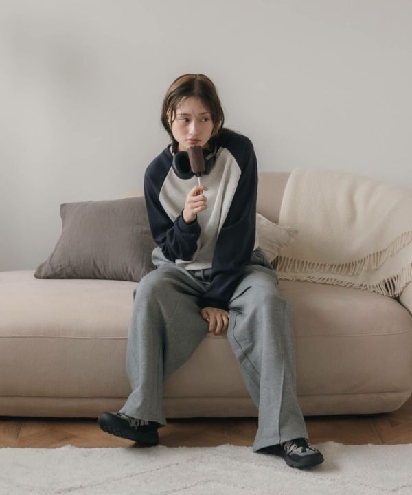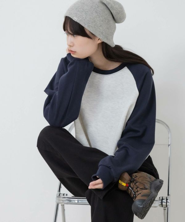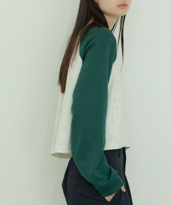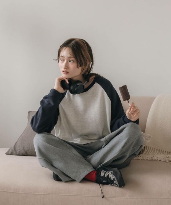 シンプルながらも、どこか目を惹くバイカラーが映えるラグランスリーブTシャツ。
