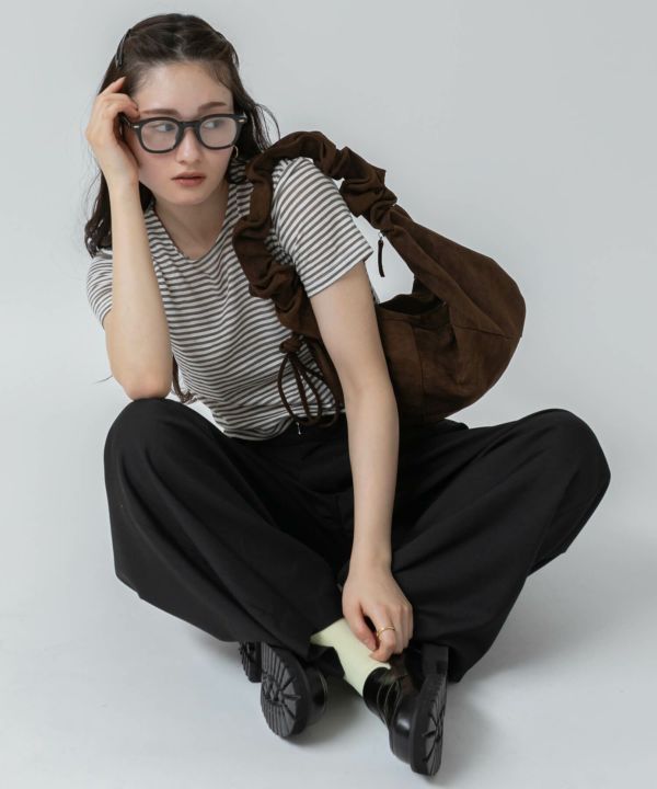 無地のカットソーにシンプルなワイドパンツ、フラットなレザーシューズを合わせて、全体をトーンミックスでまとめるスタイリングが◎。