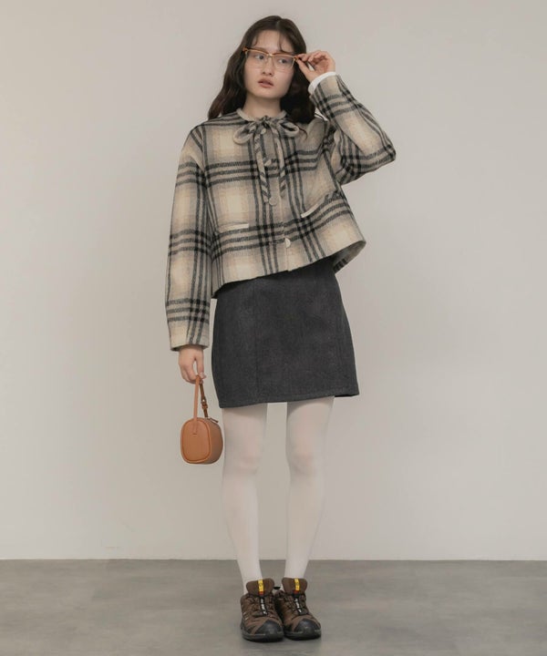 ベージュ系チェックはミニスカートやリブタイツやブーツと合わせてレディな