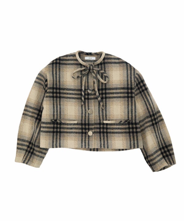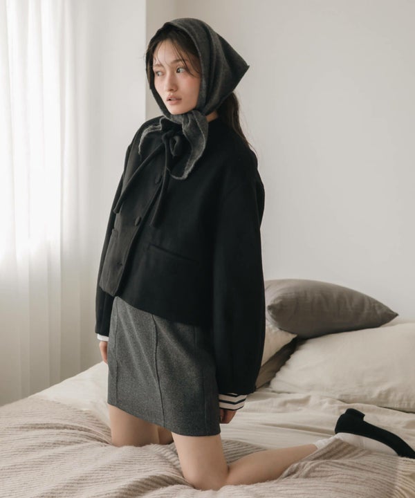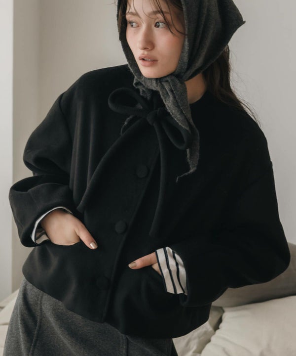 首元に結んだリボンタイがポイントのショート丈コート。