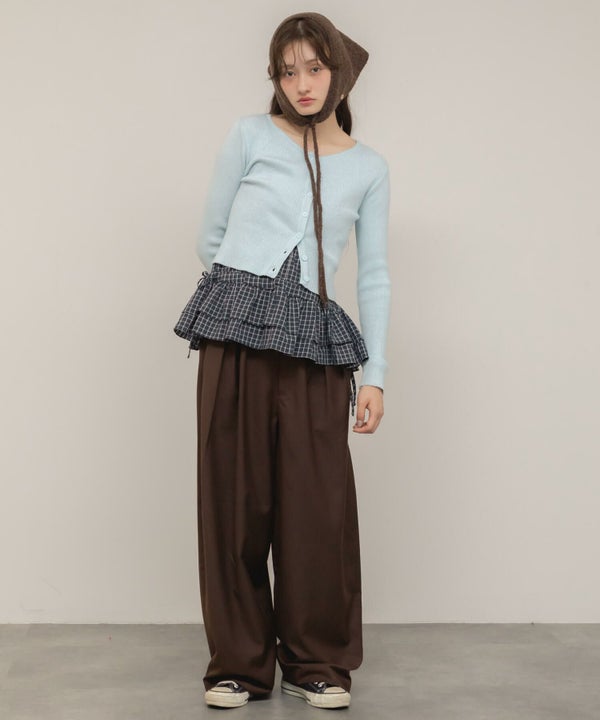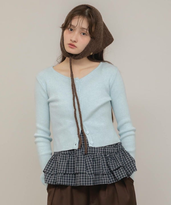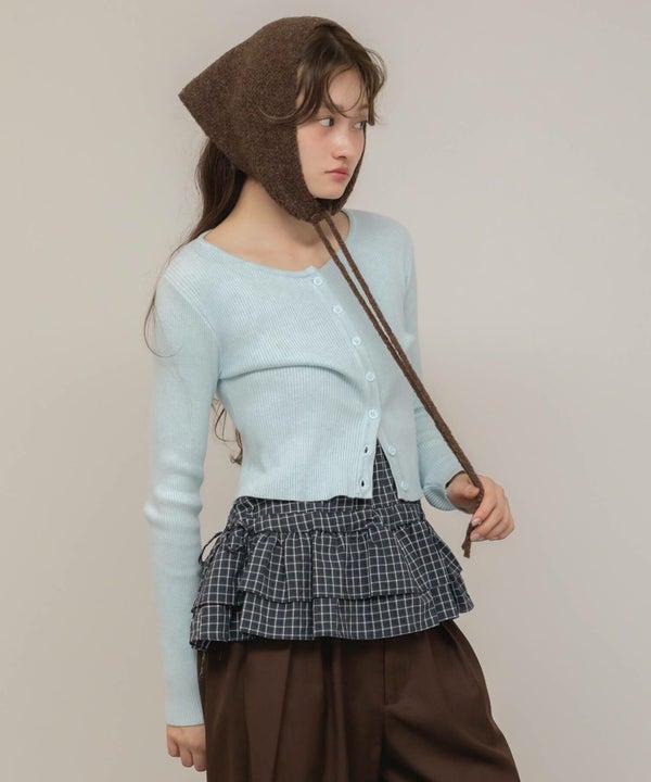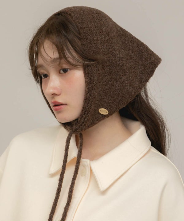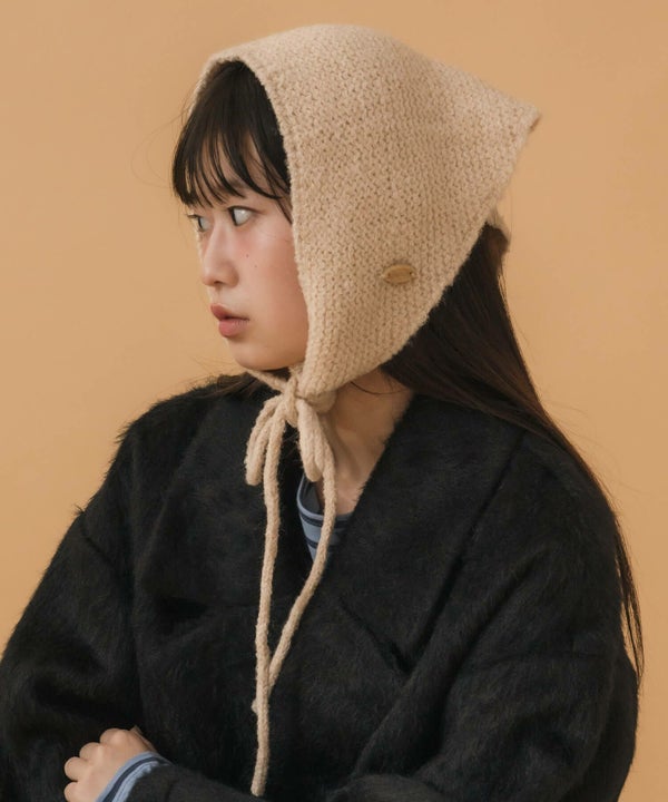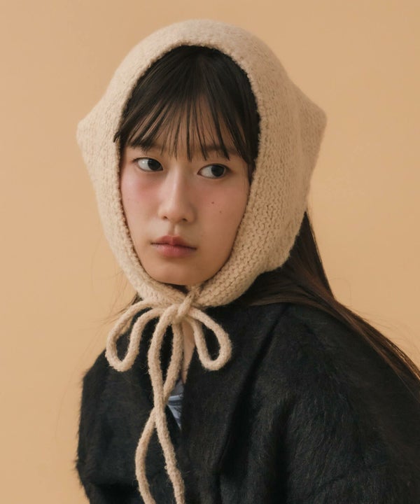 顎下で結ぶリボンタイが印象的なニット帽。