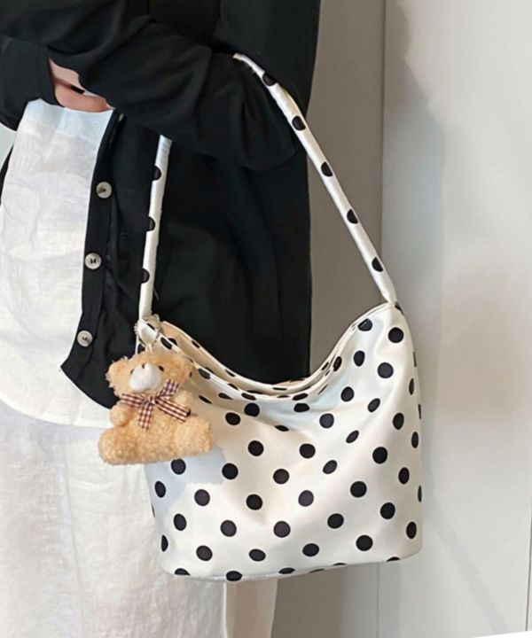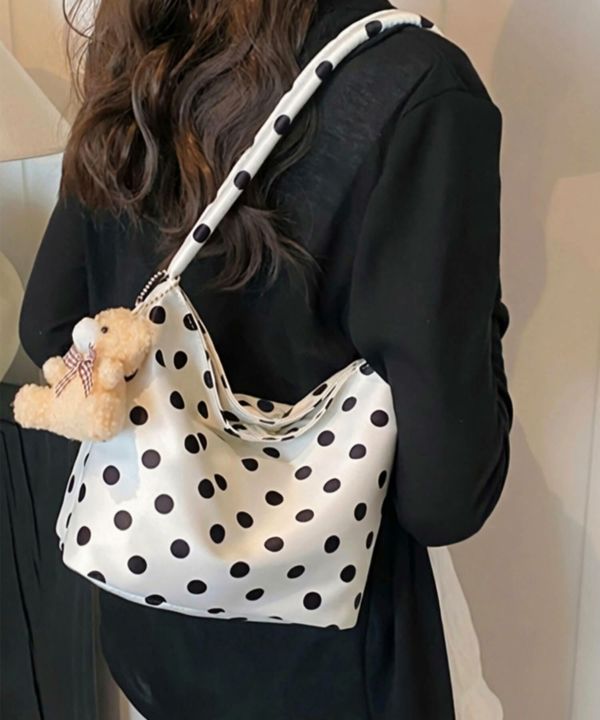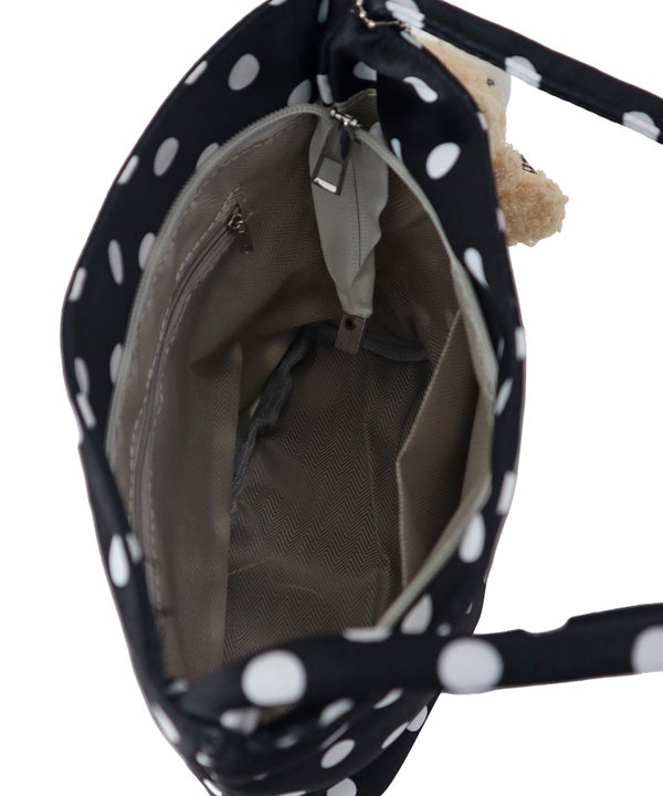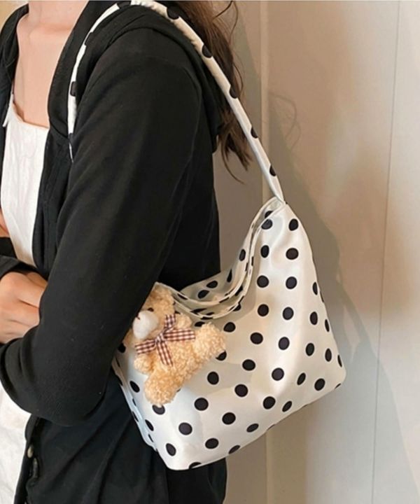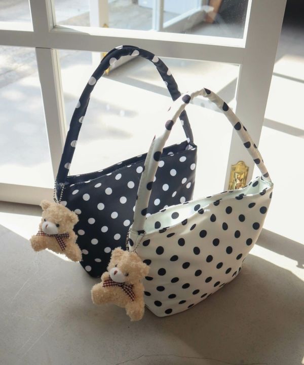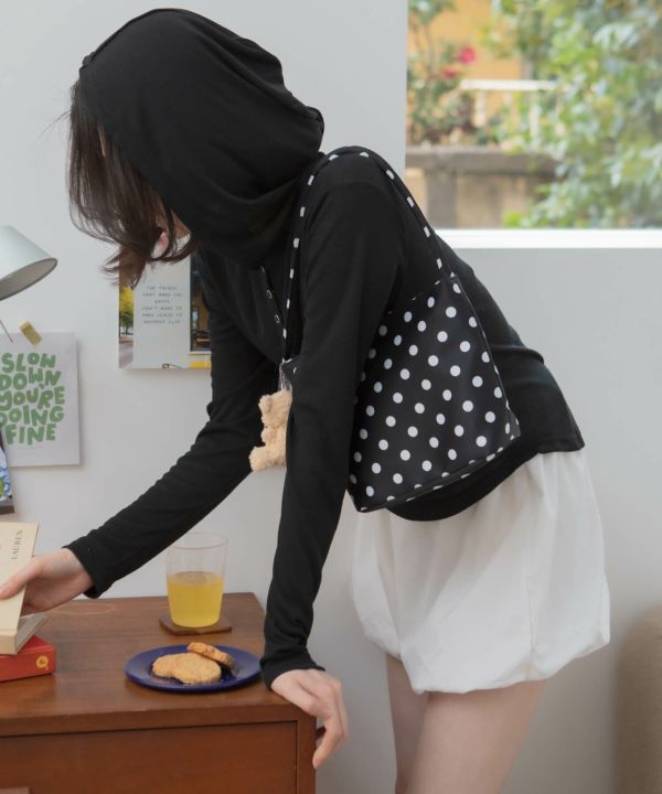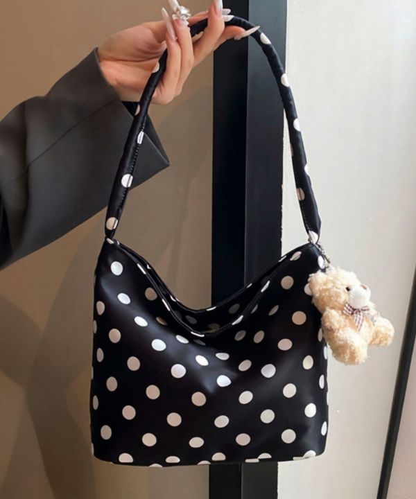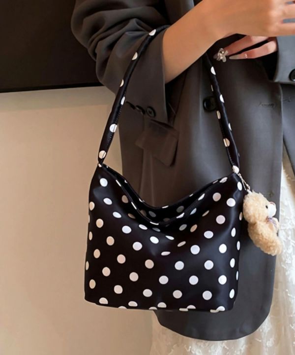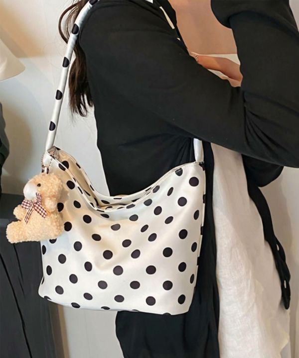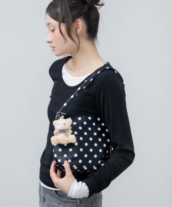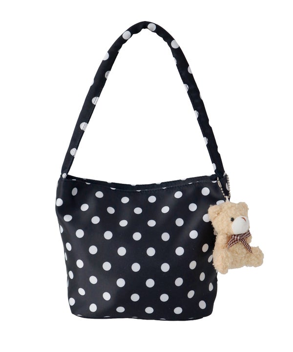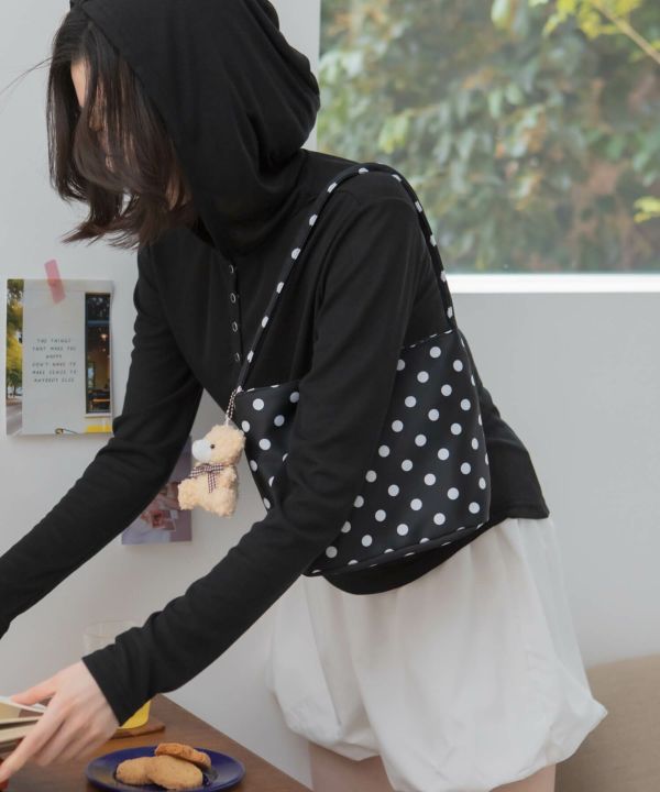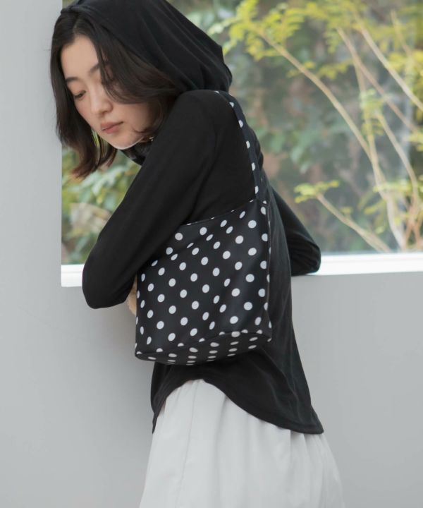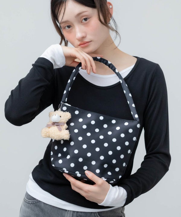 コーデのポイントになるドット柄のハンドバッグ。