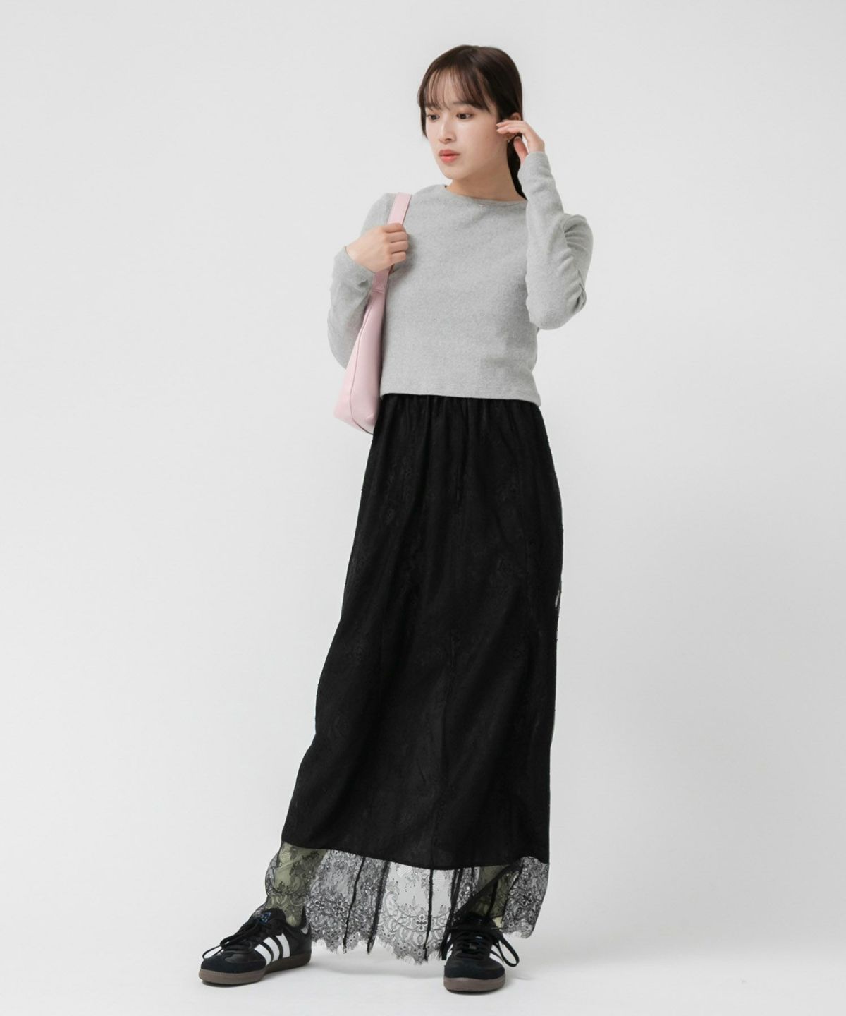 繊細で華やかなレースのタイトスリットスカート Lace Embroidery Flower Long Skirt