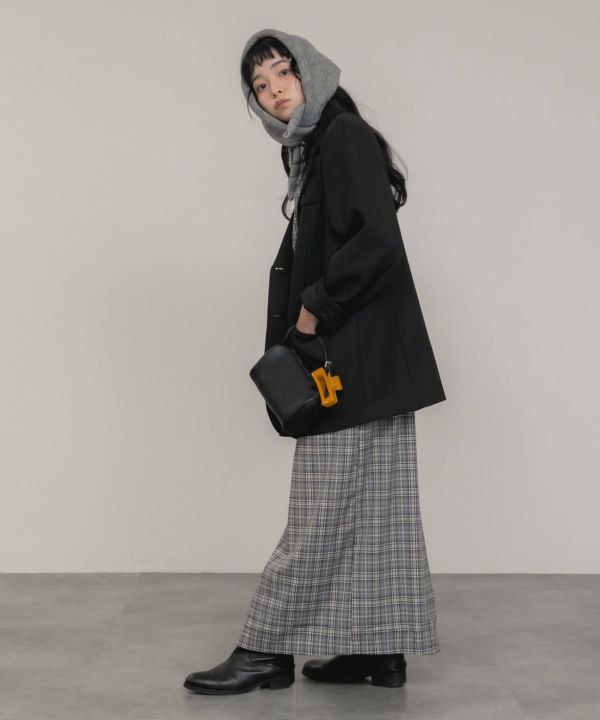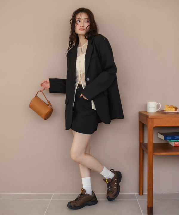 ゆるっとしたオーバーなシルエットなのでボトムにミニ丈を合わせると、ほどよいラフさが加わり、バランスの取れた着こなしに。