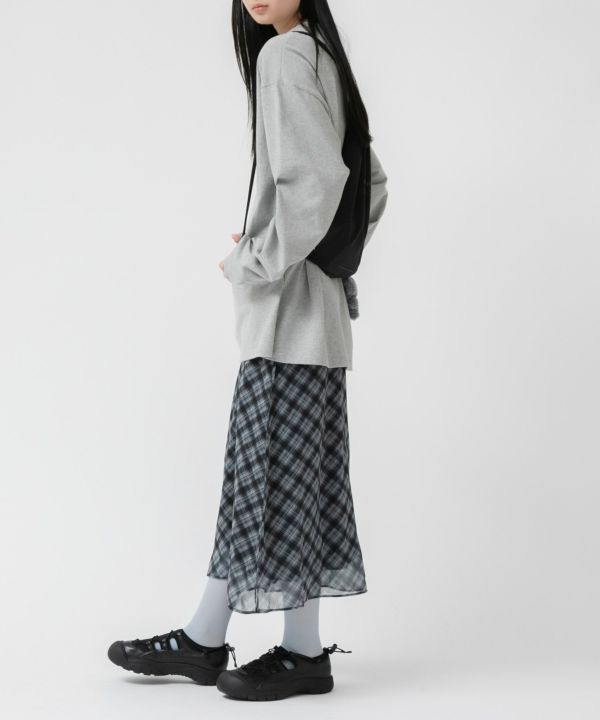 体型を拾わないオーバーシルエットとおしりが隠れる長めの丈感で華奢見えする1着です。