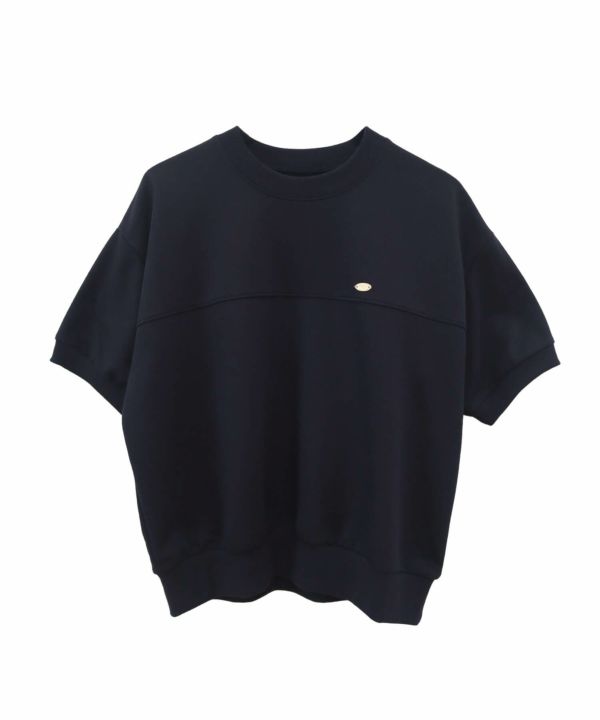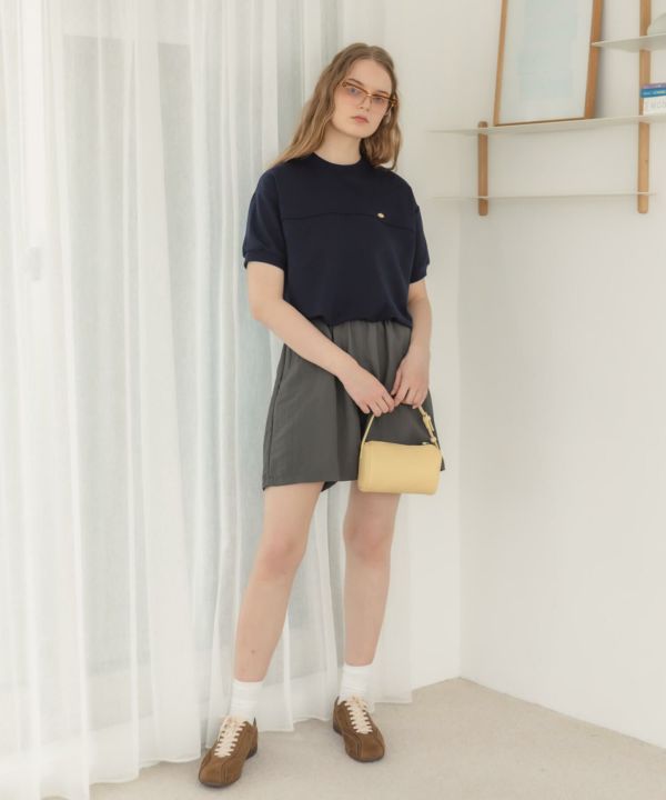 胸元に切り替えを入れたミニマルなデザインに、さりげなく光るゴールドプレートがアクセント。
