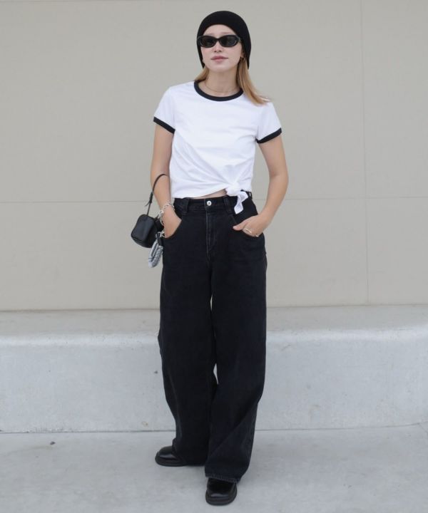 裾をラフに結んで肌見せアレンジを加えると、スタイリングに動きとリズムが生まれます。