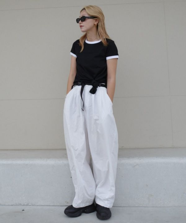 トップスのコンパクトなフォルムと裾のデザインが引き立ち、