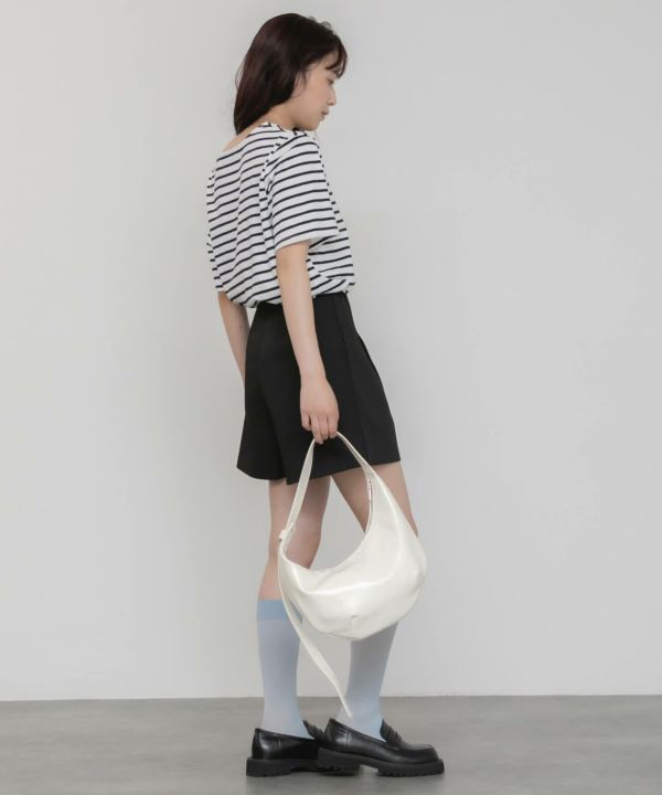 ネイビーのボーダーは、ブラックのショートパンツとローファーでまとめるとミニマルなコーデに仕上がります。