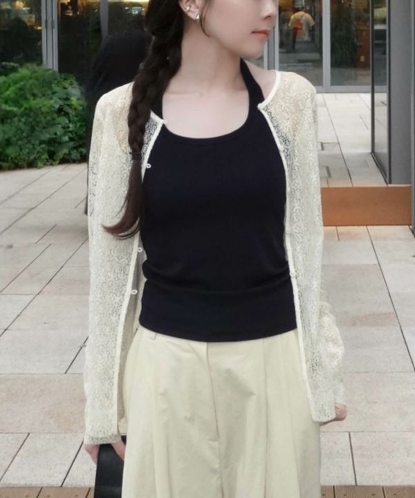 ベーシックなキャミソールに重ねるだけで、レディライクなスタイリングが完成。
