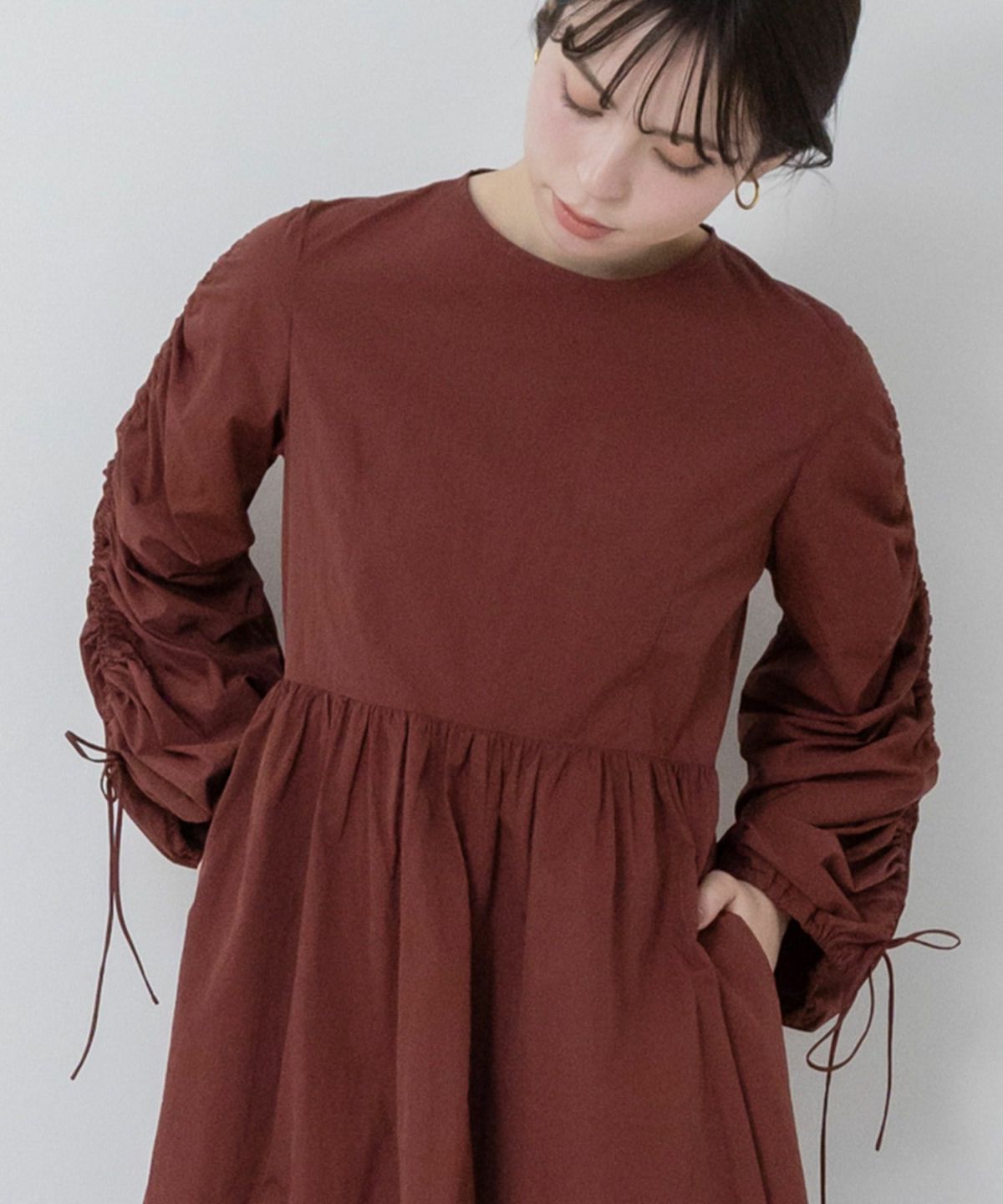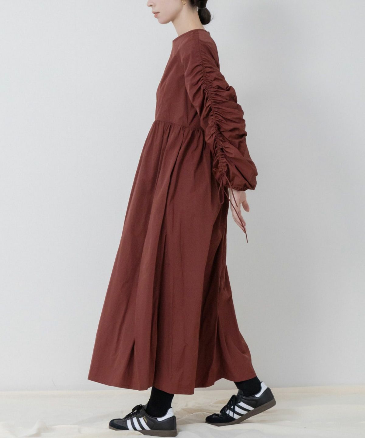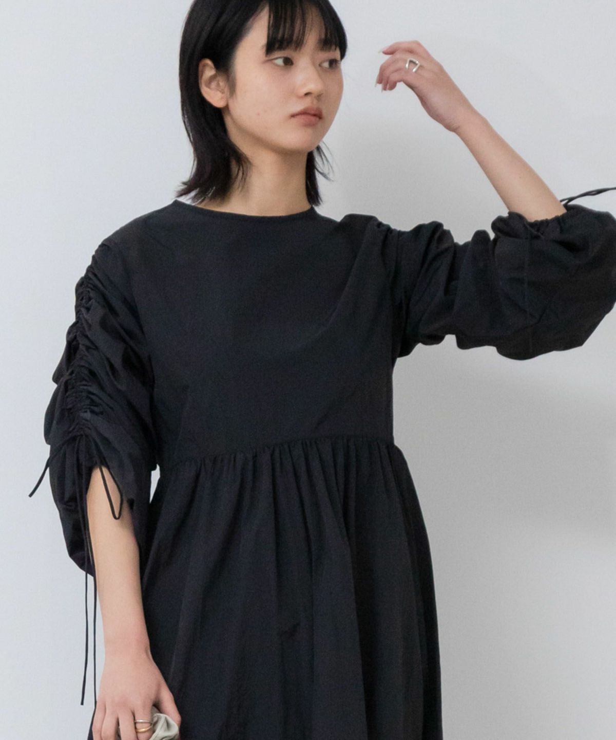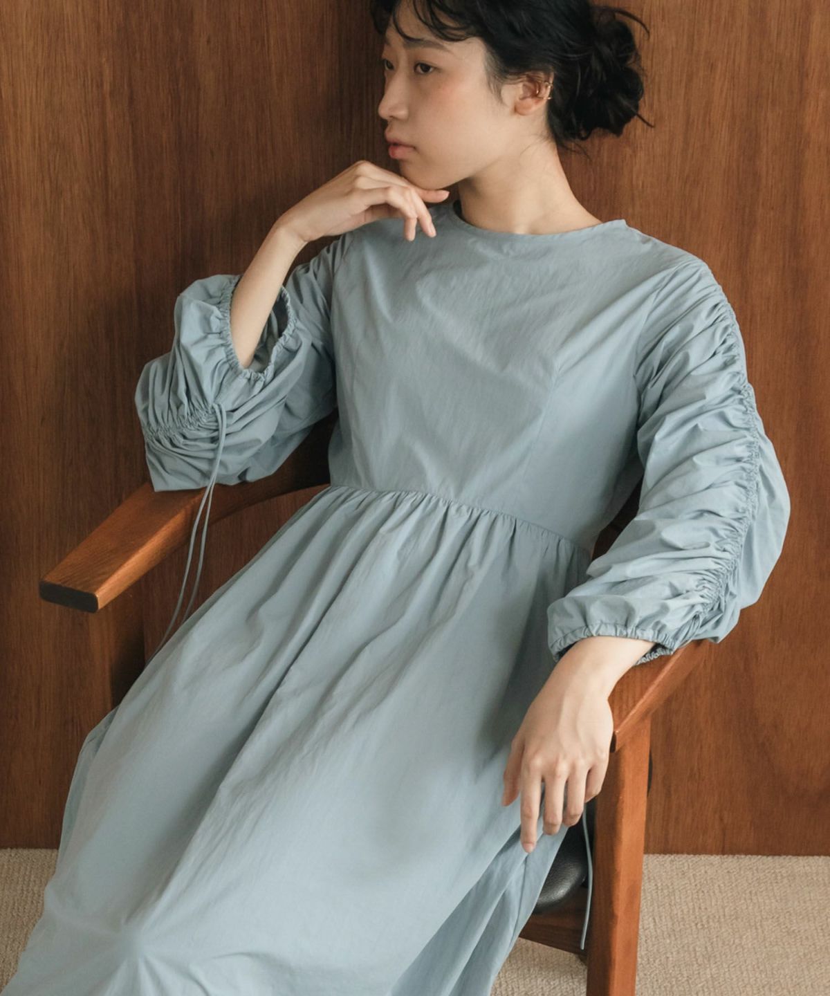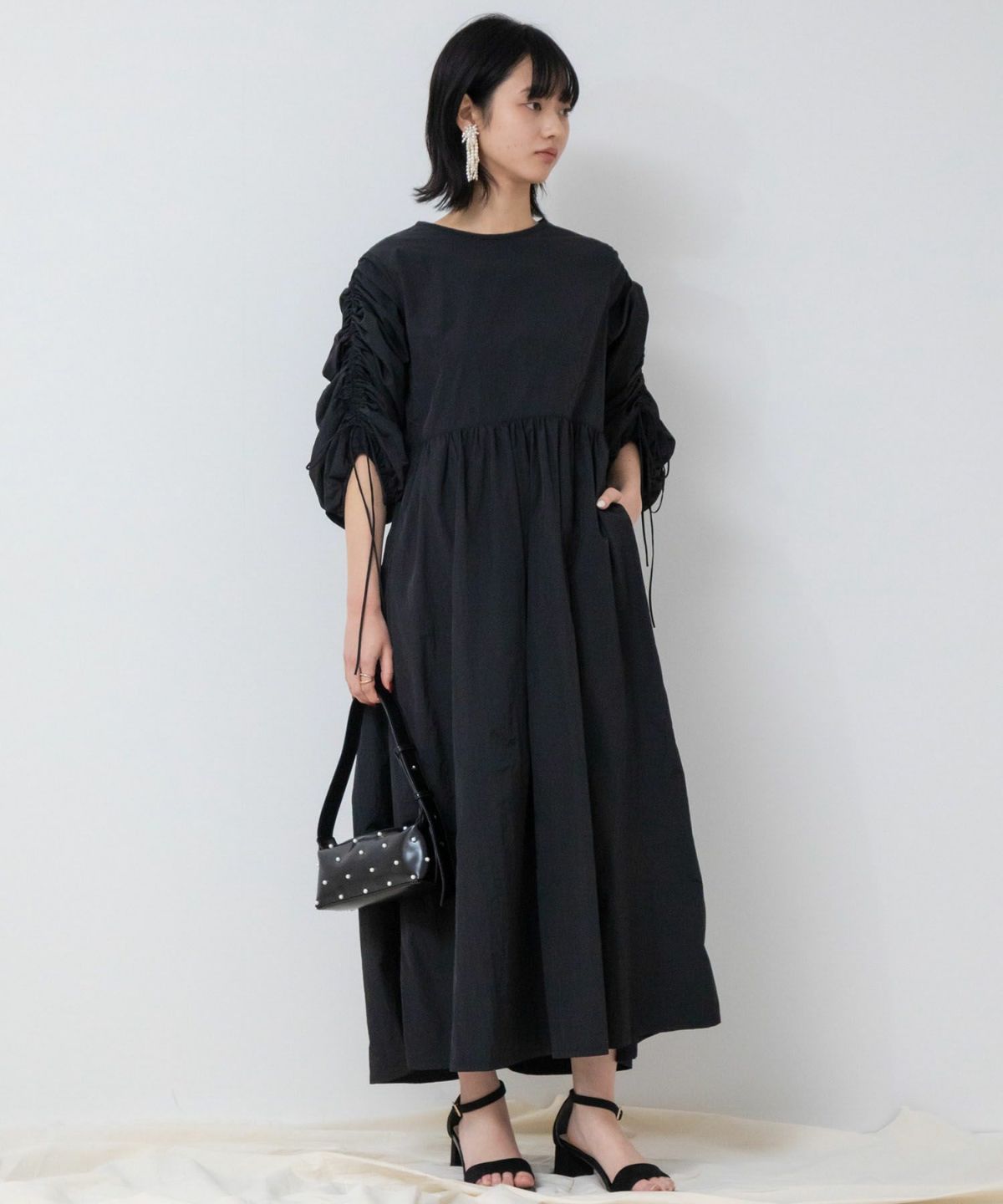 1枚で華やかなトレンドスタイルが完成するギャザーたっぷりのお袖が存在感抜群のワンピース 【Original】2Way Sleeve Shirring Nylon Dress