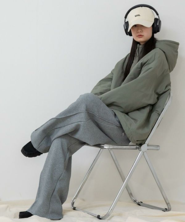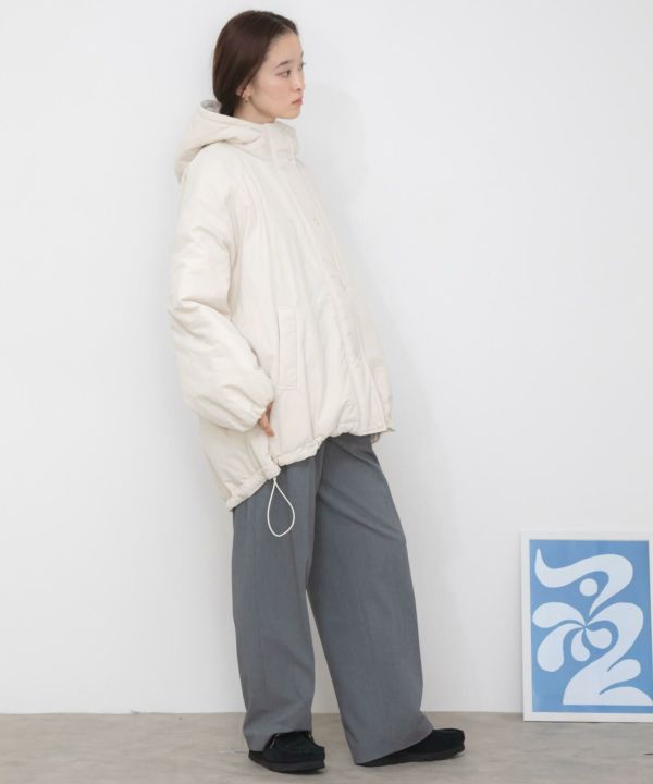 ゆるやかなAラインのフレアシルエットですが裾のドローストリングを引いて着ると、丸みのあるコクーンシルエットに。