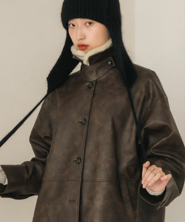 古着のようなヴィンテージライクなフェイクレザー素材で仕立てたジャケット。