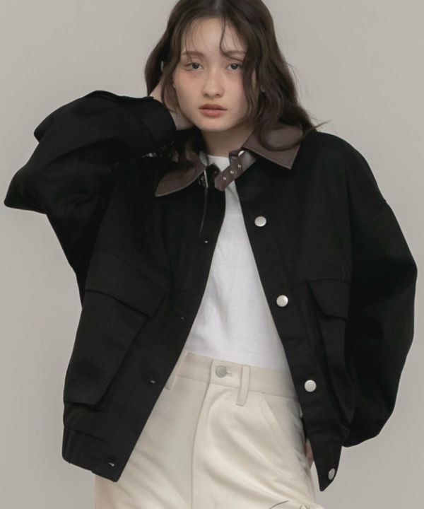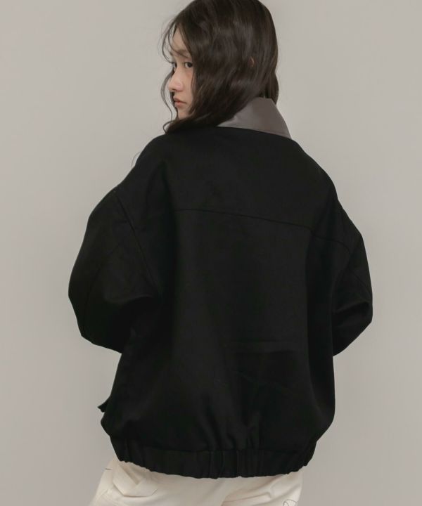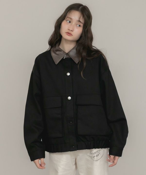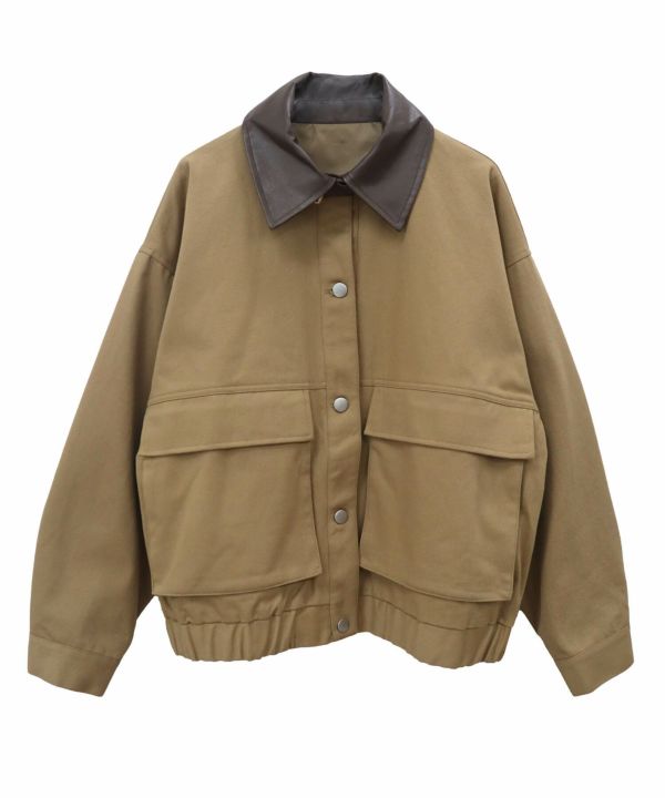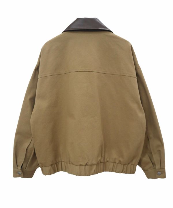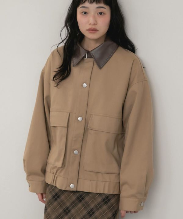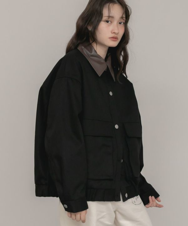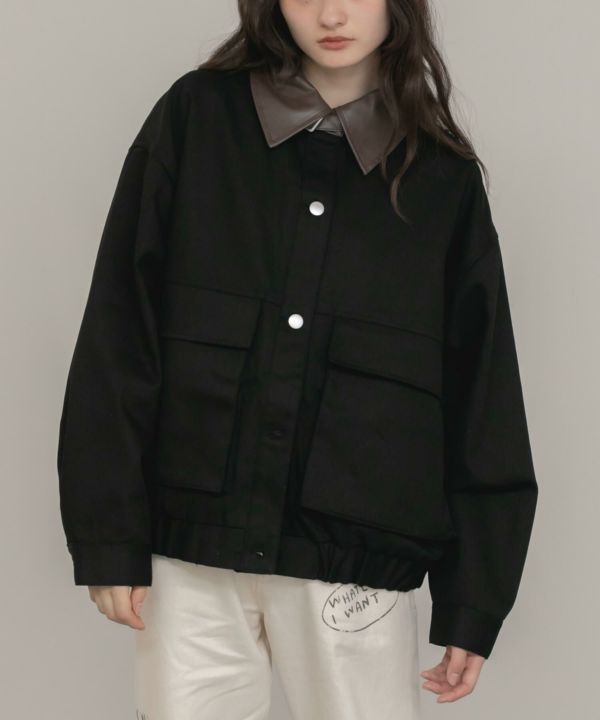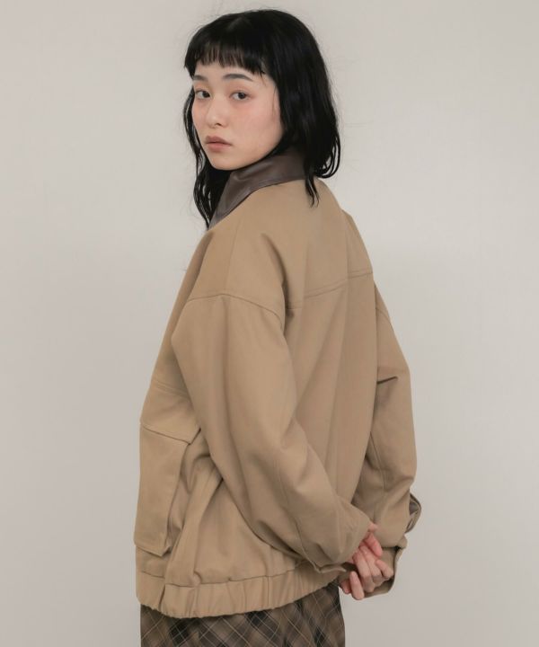 フェイクレザーの襟をポイントとして効かせたブルゾン。