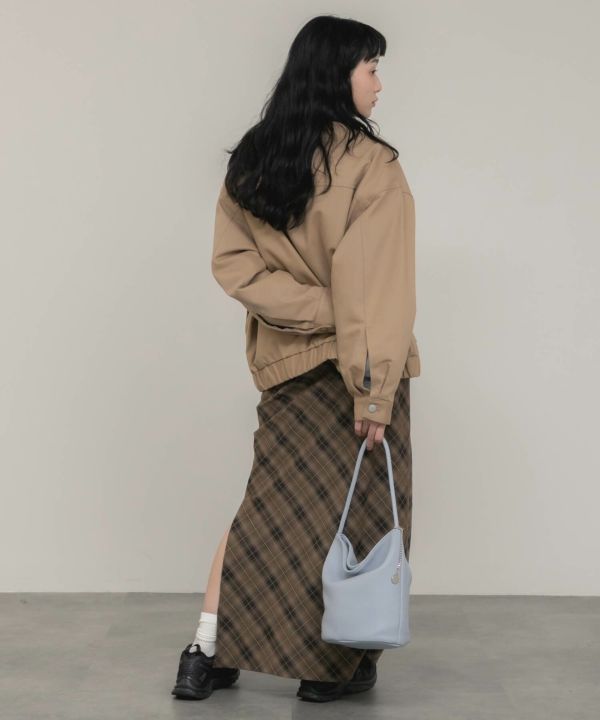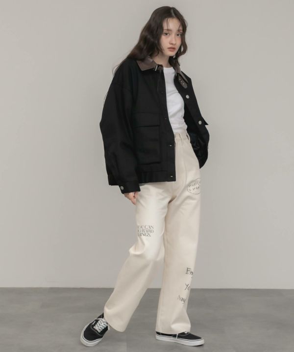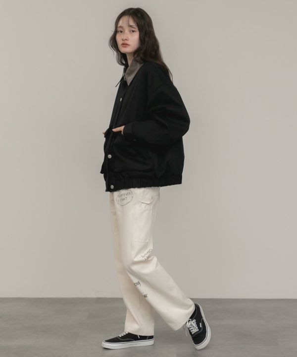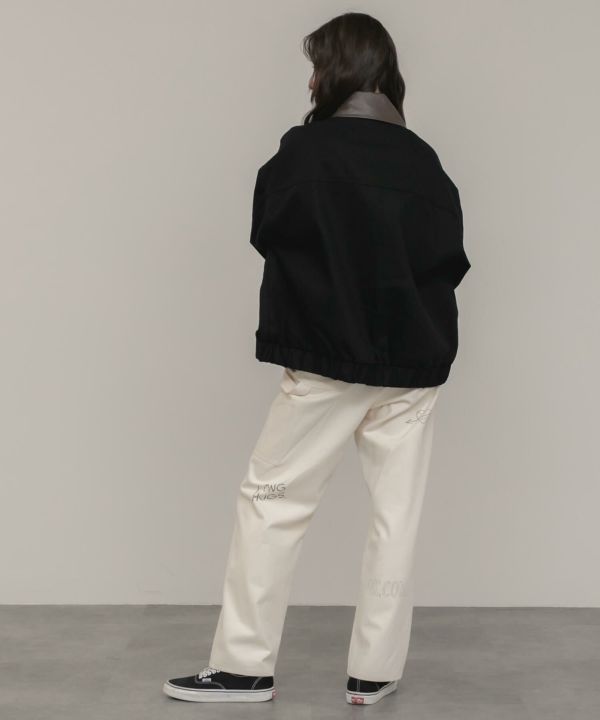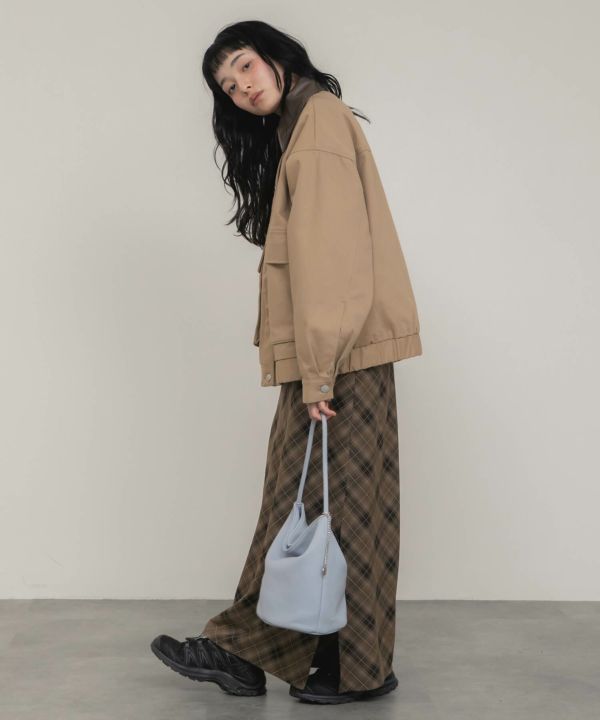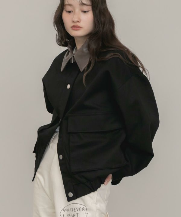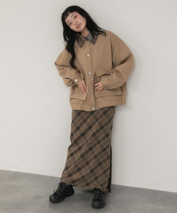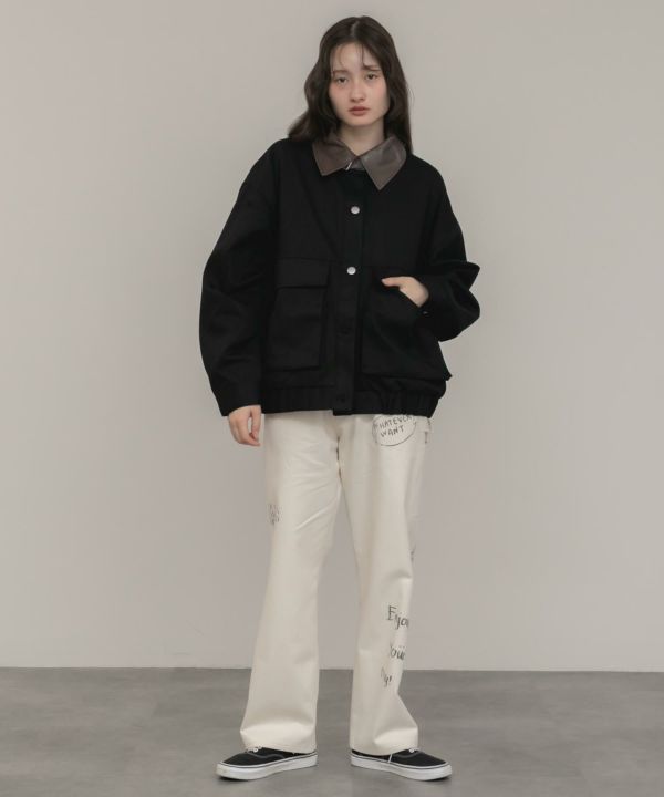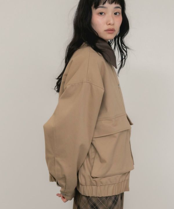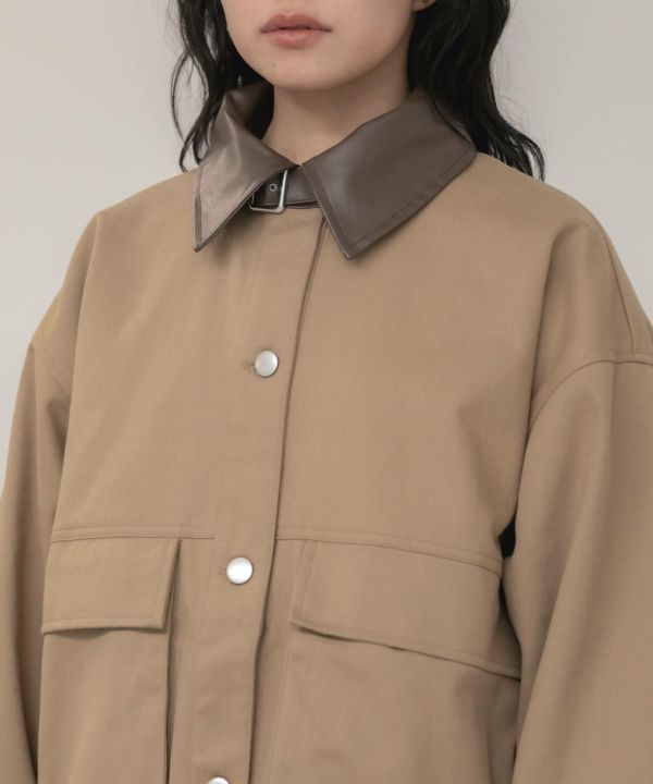 フェイクレザーの襟をポイントとして効かせたブルゾン。