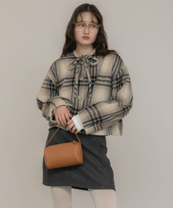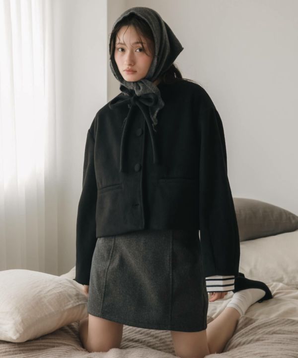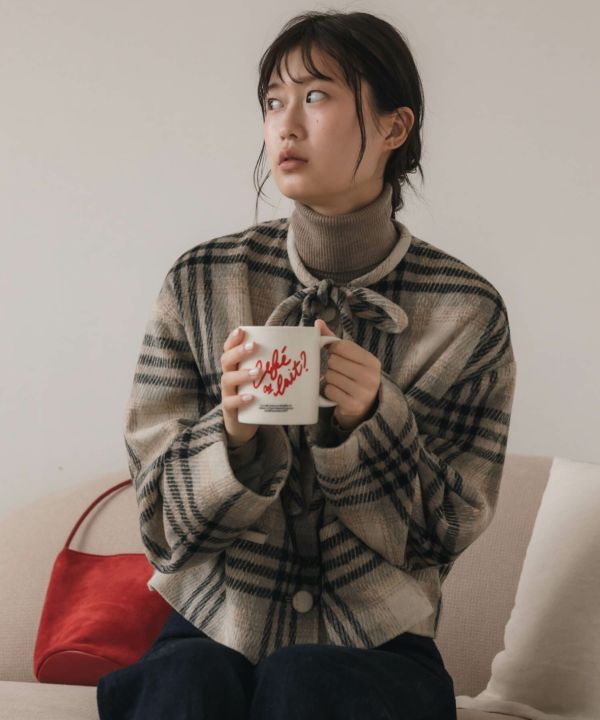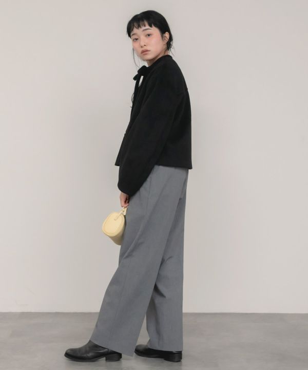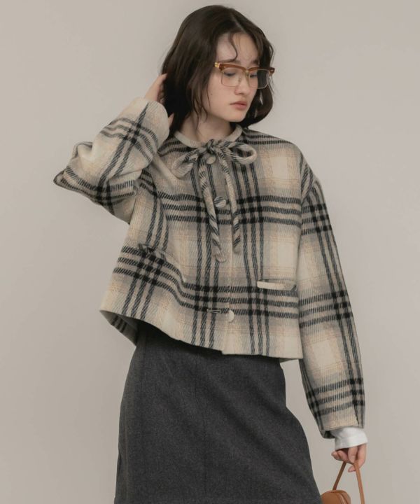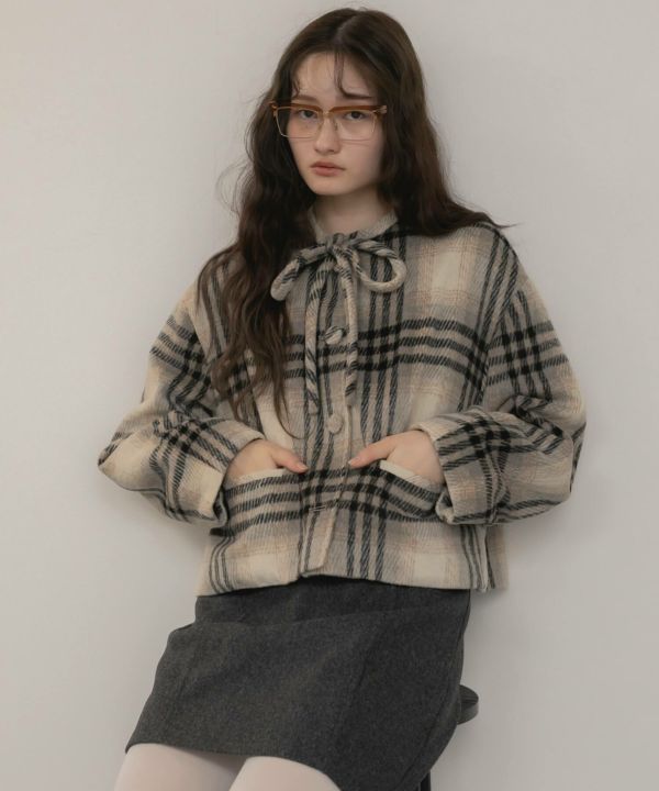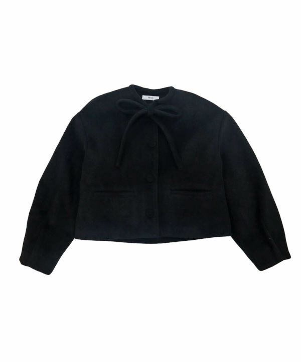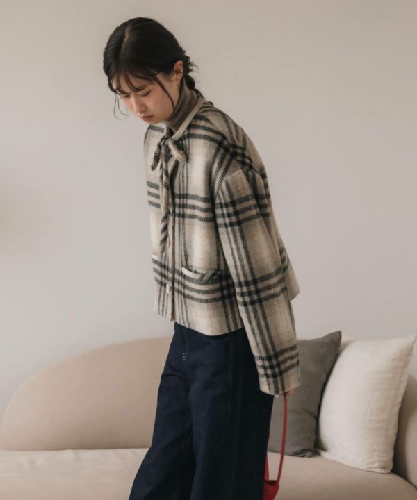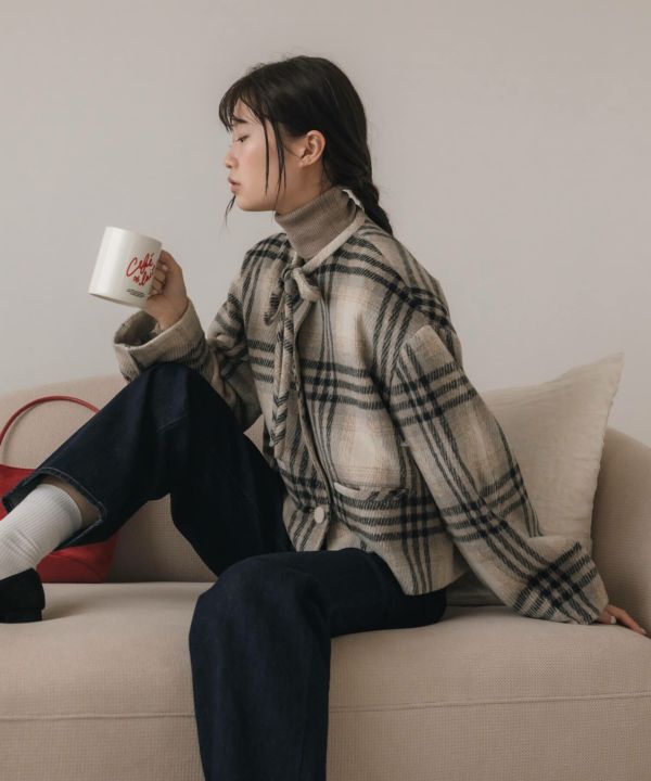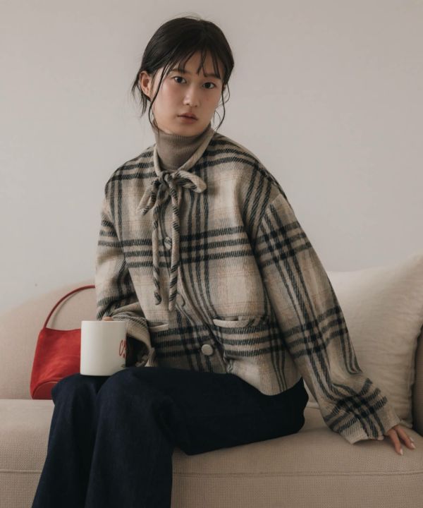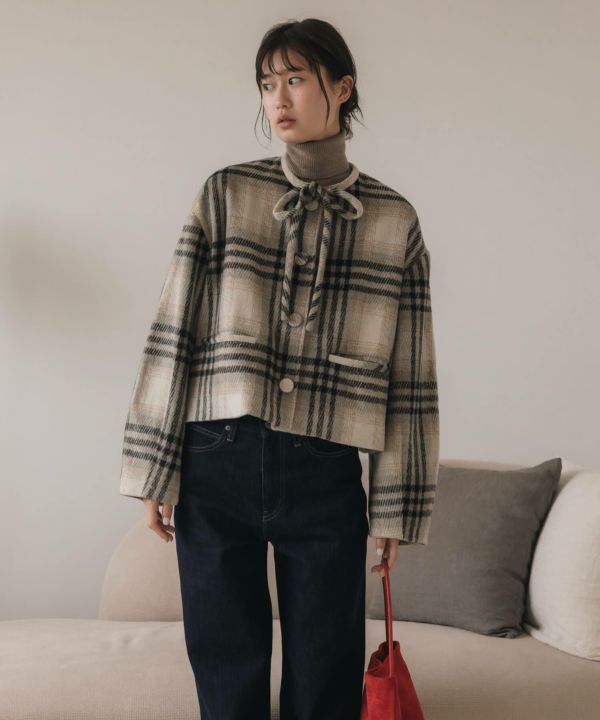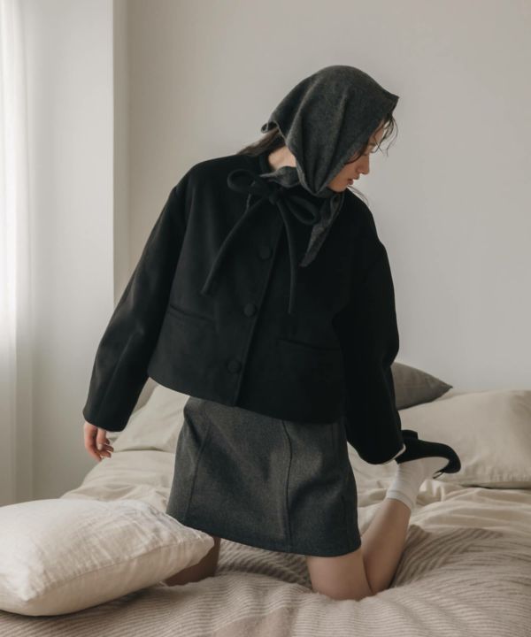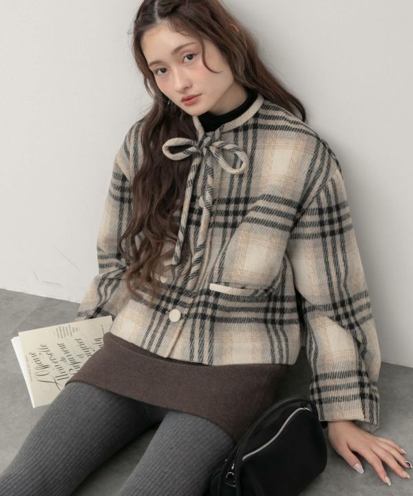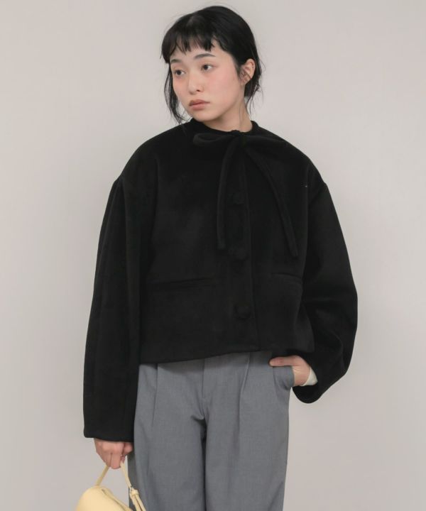 首元に結んだリボンタイがポイントのショート丈コート。