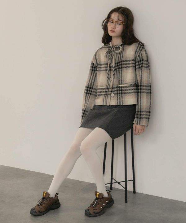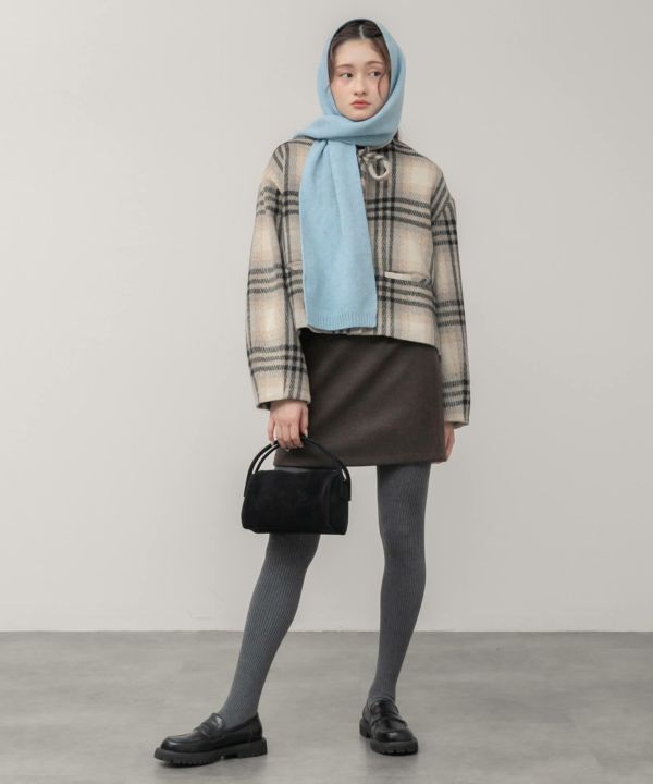 ベージュ系チェックはミニスカートやリブタイツやブーツと合わせてレディな