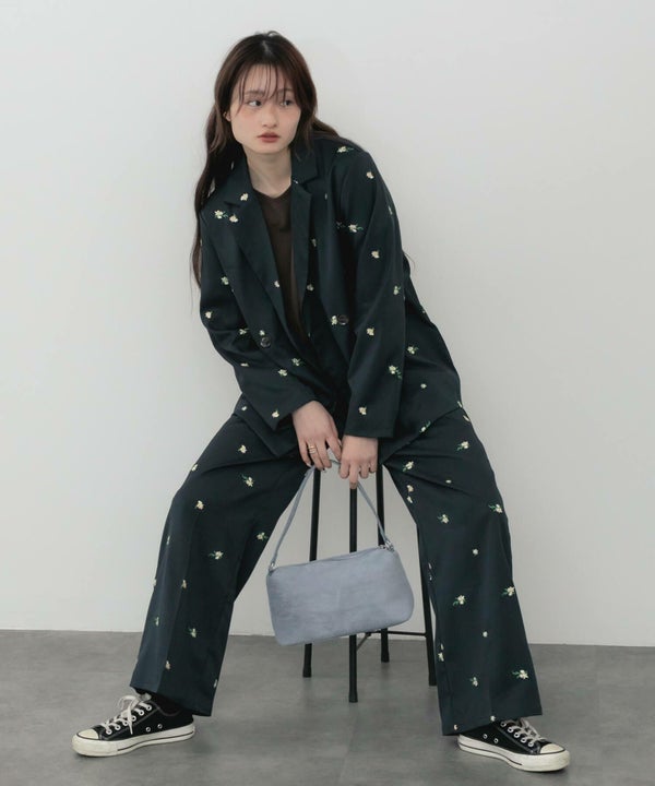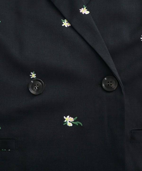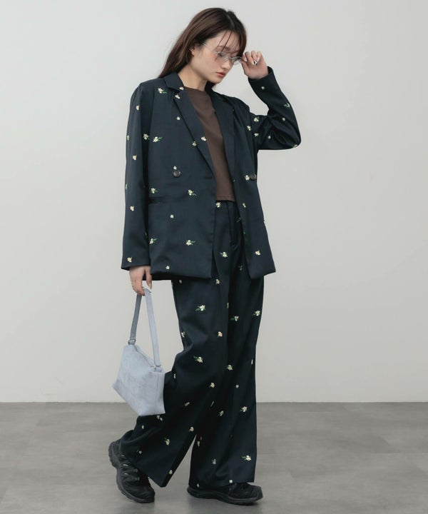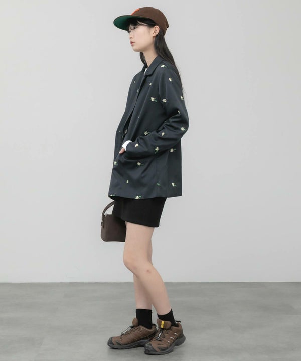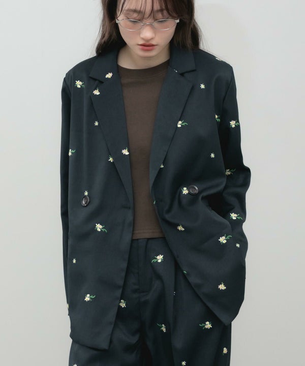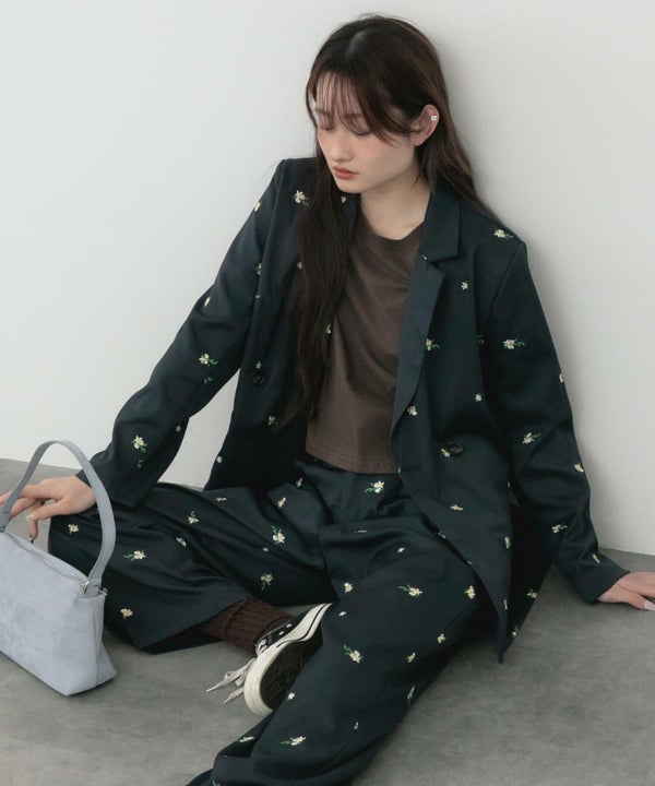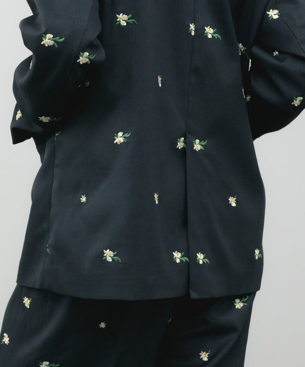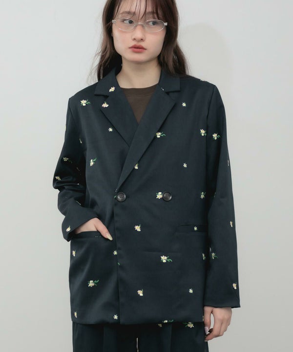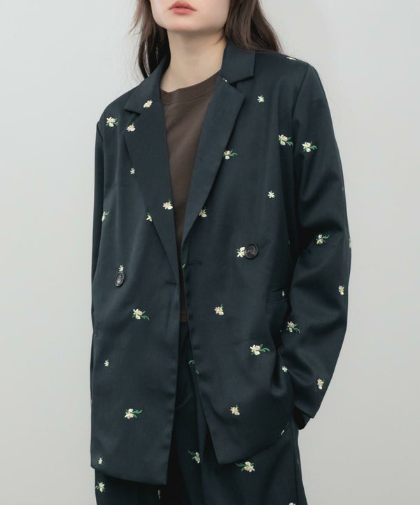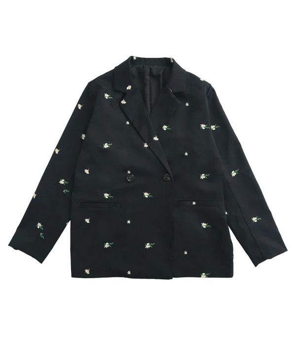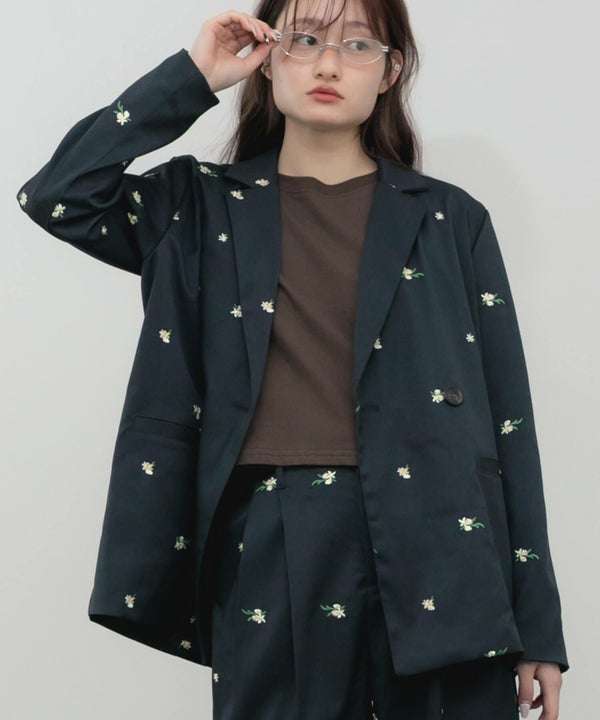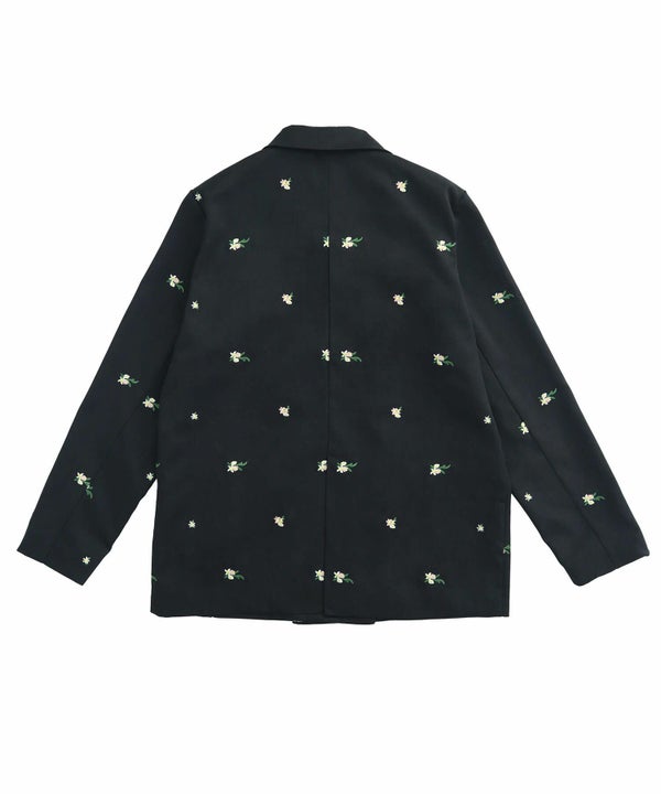 全体に散りばめられた花柄刺繍が、さりげなく個性を引き立てるオーバーサイズジャケット。