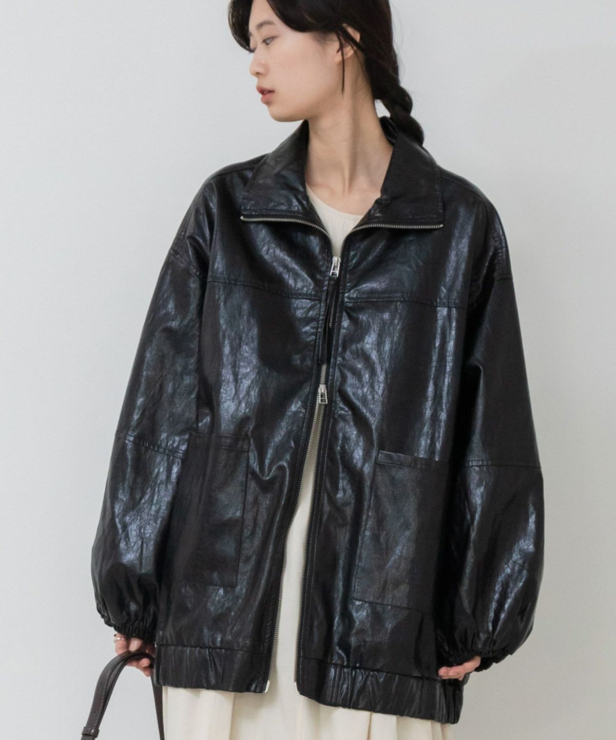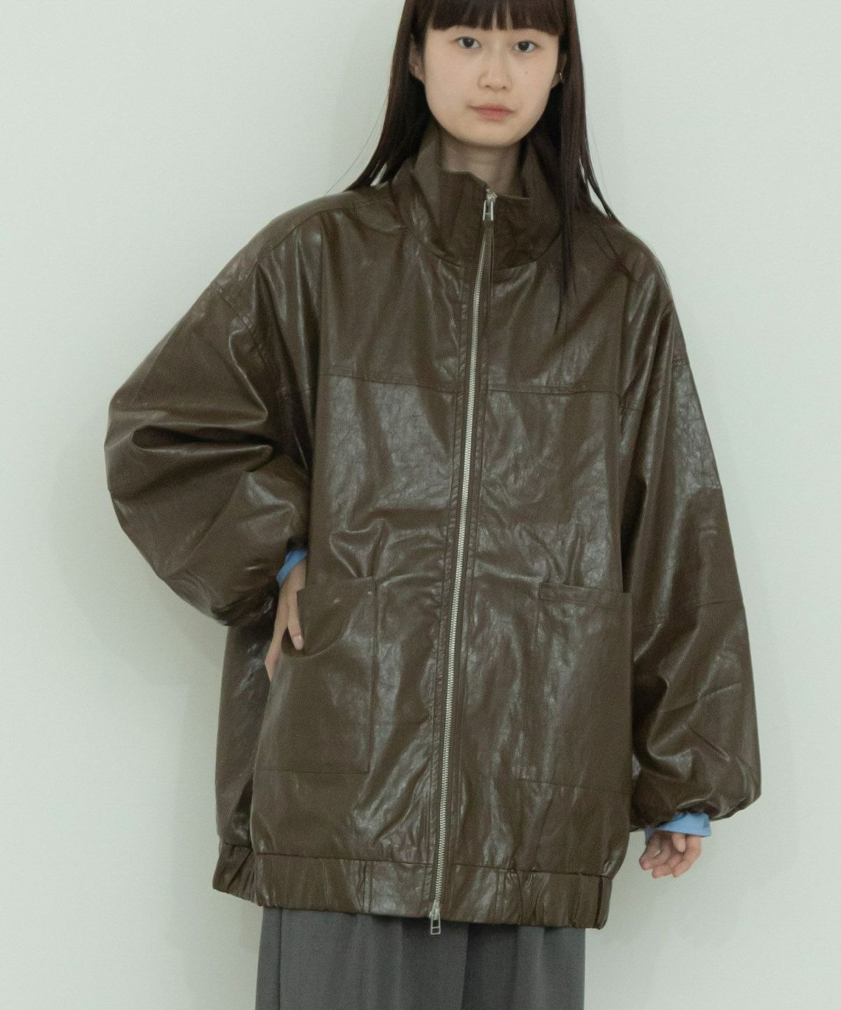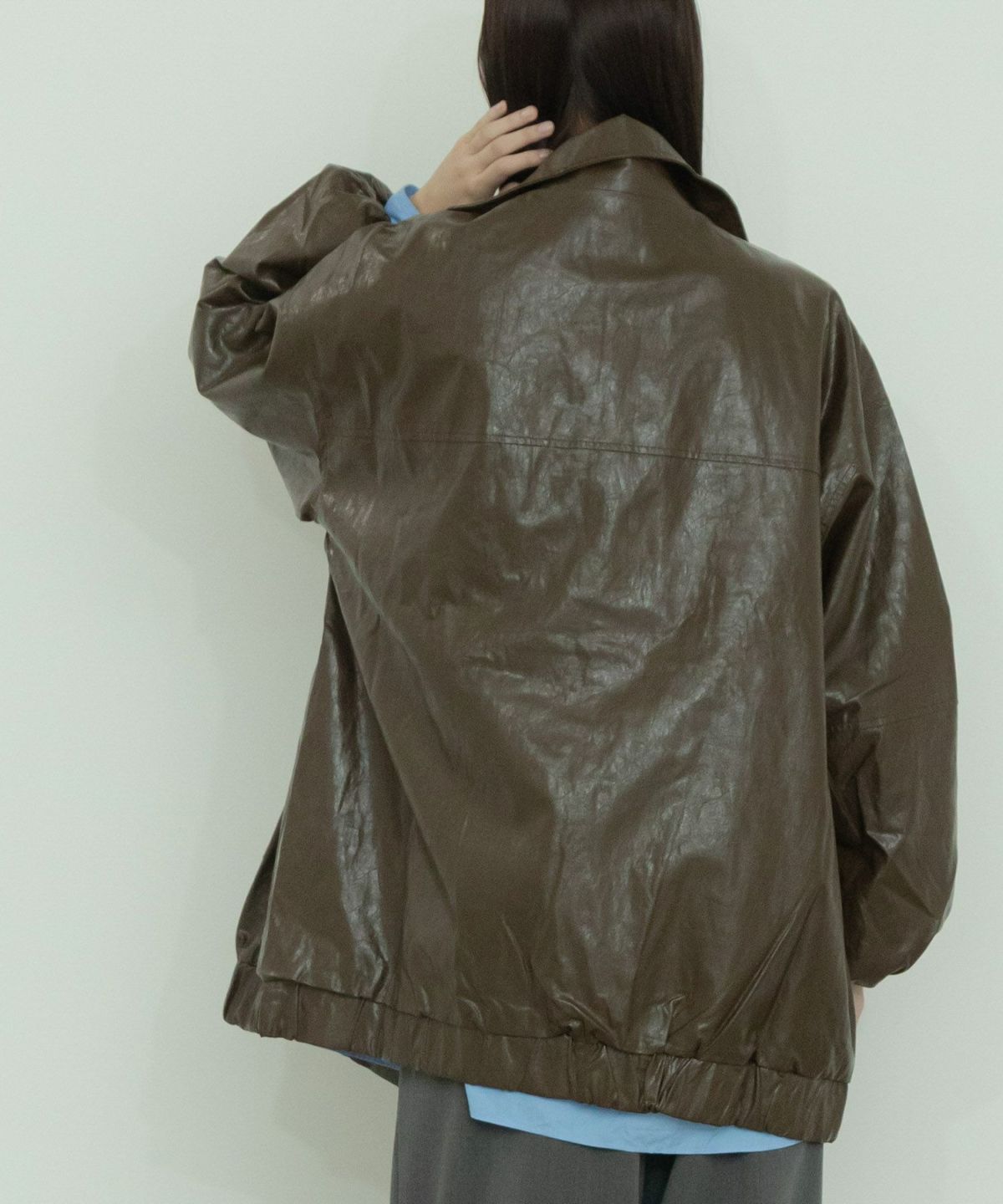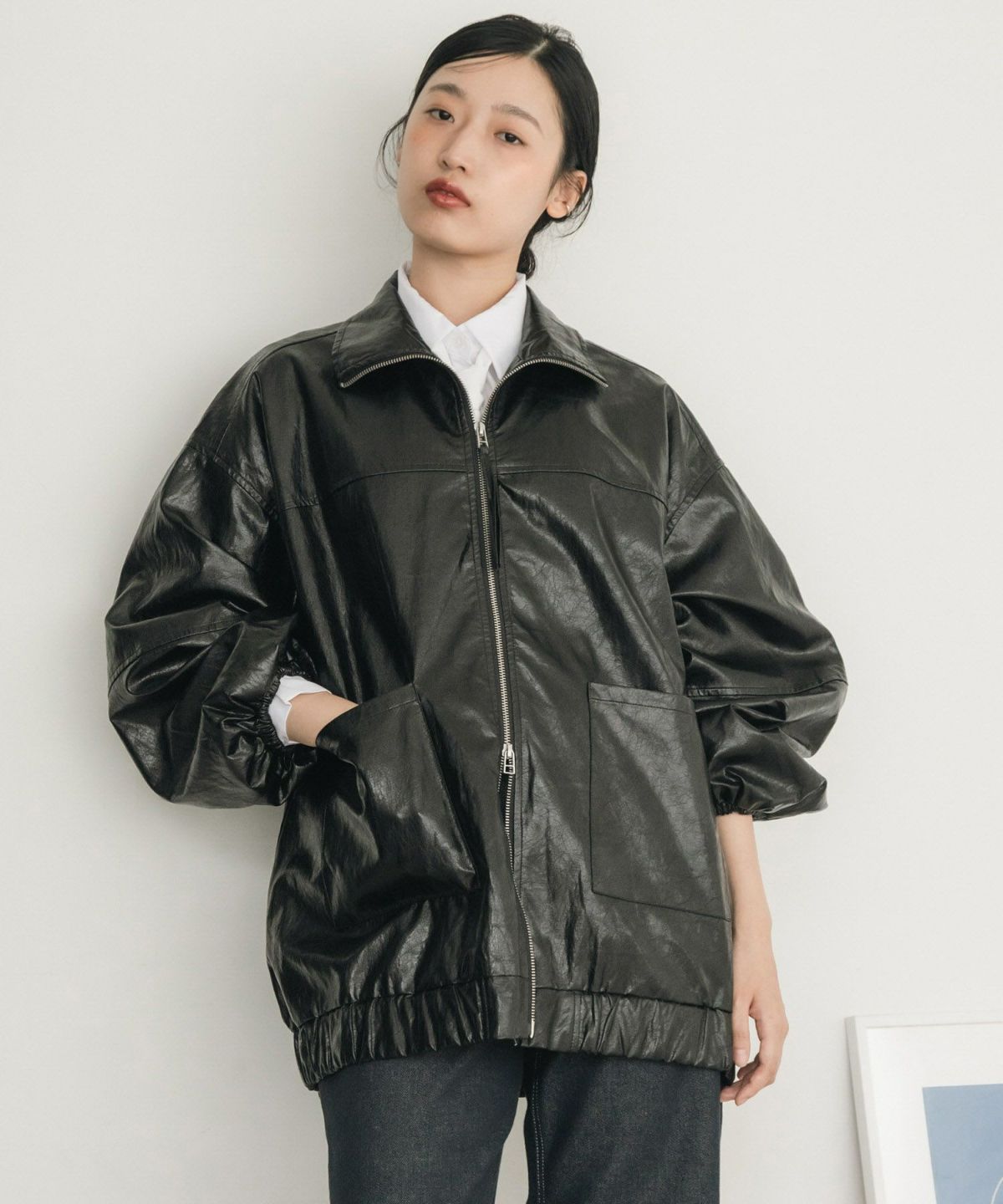 ヴィンテージ感のある雰囲気に仕上げたフェイクレザーブルゾン Vintage Like Fake Leather Stand Blouson