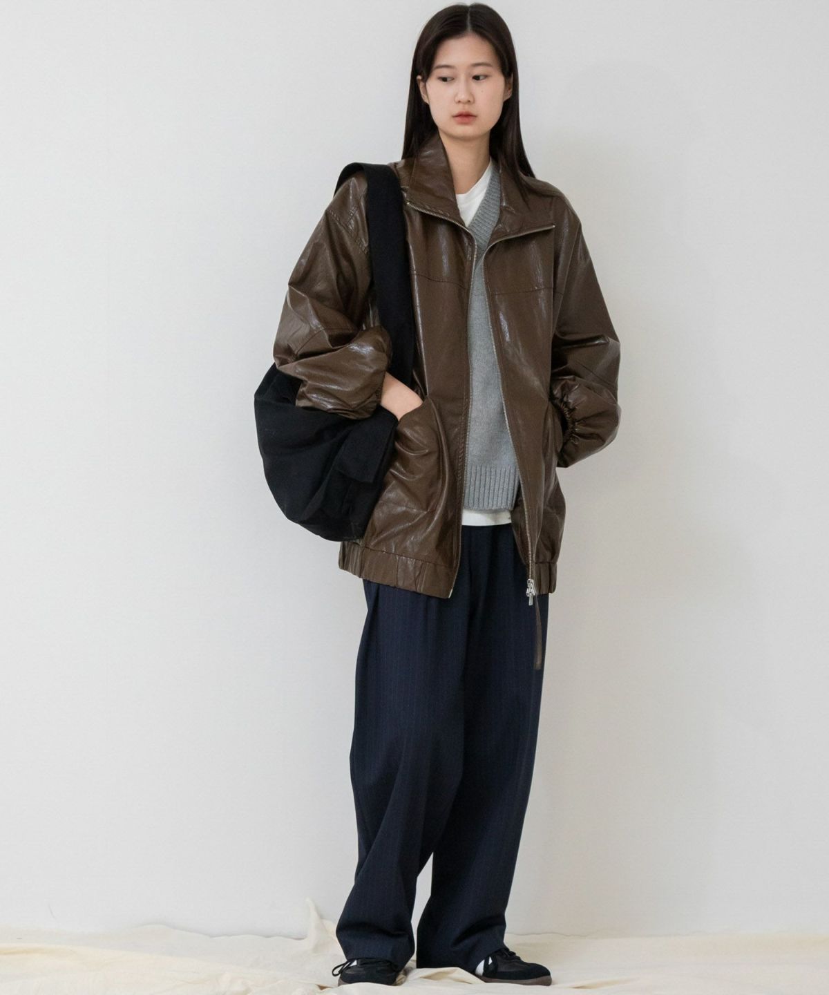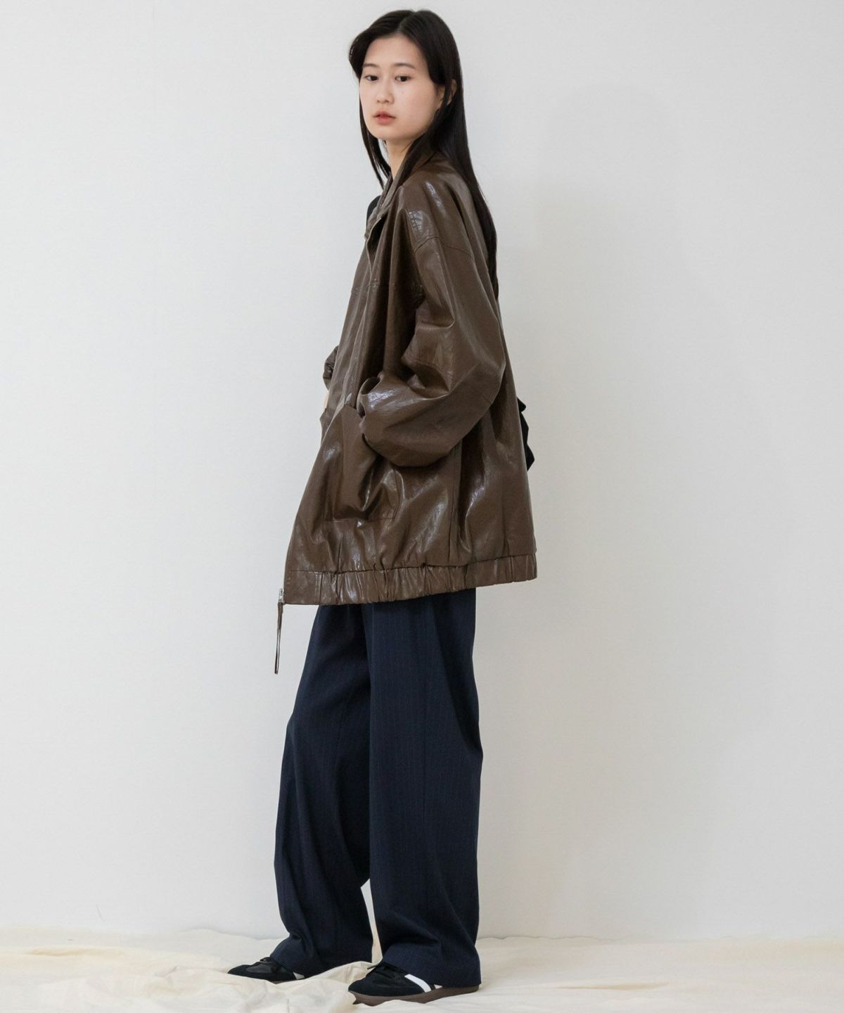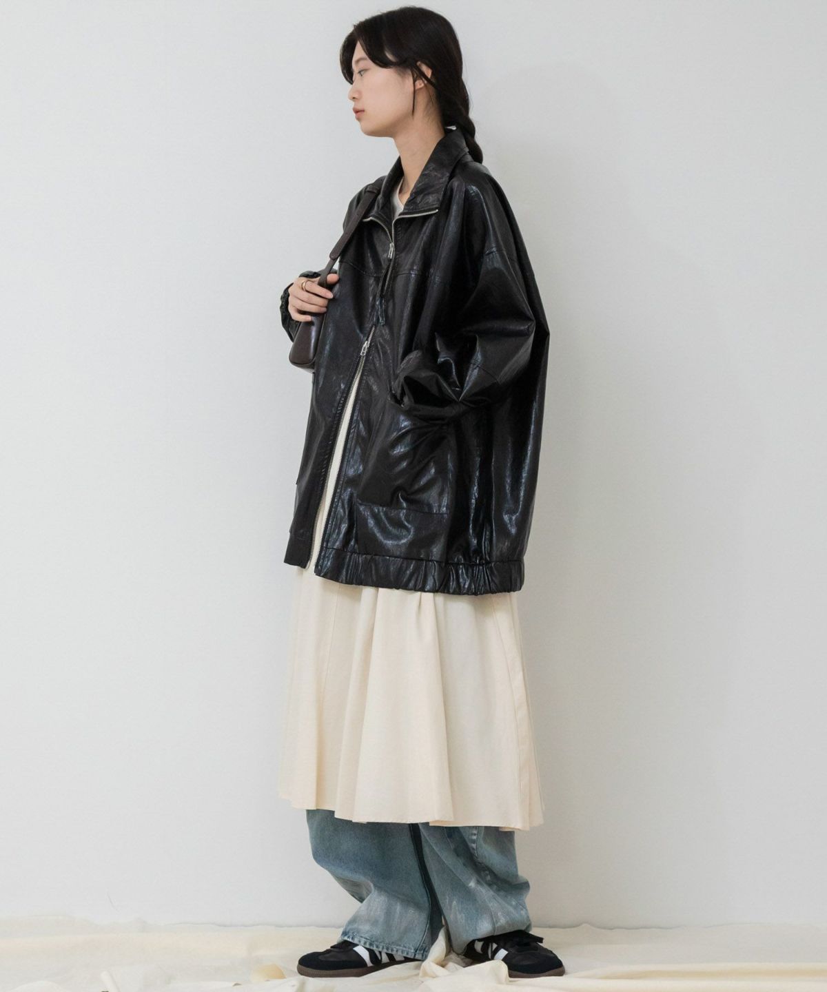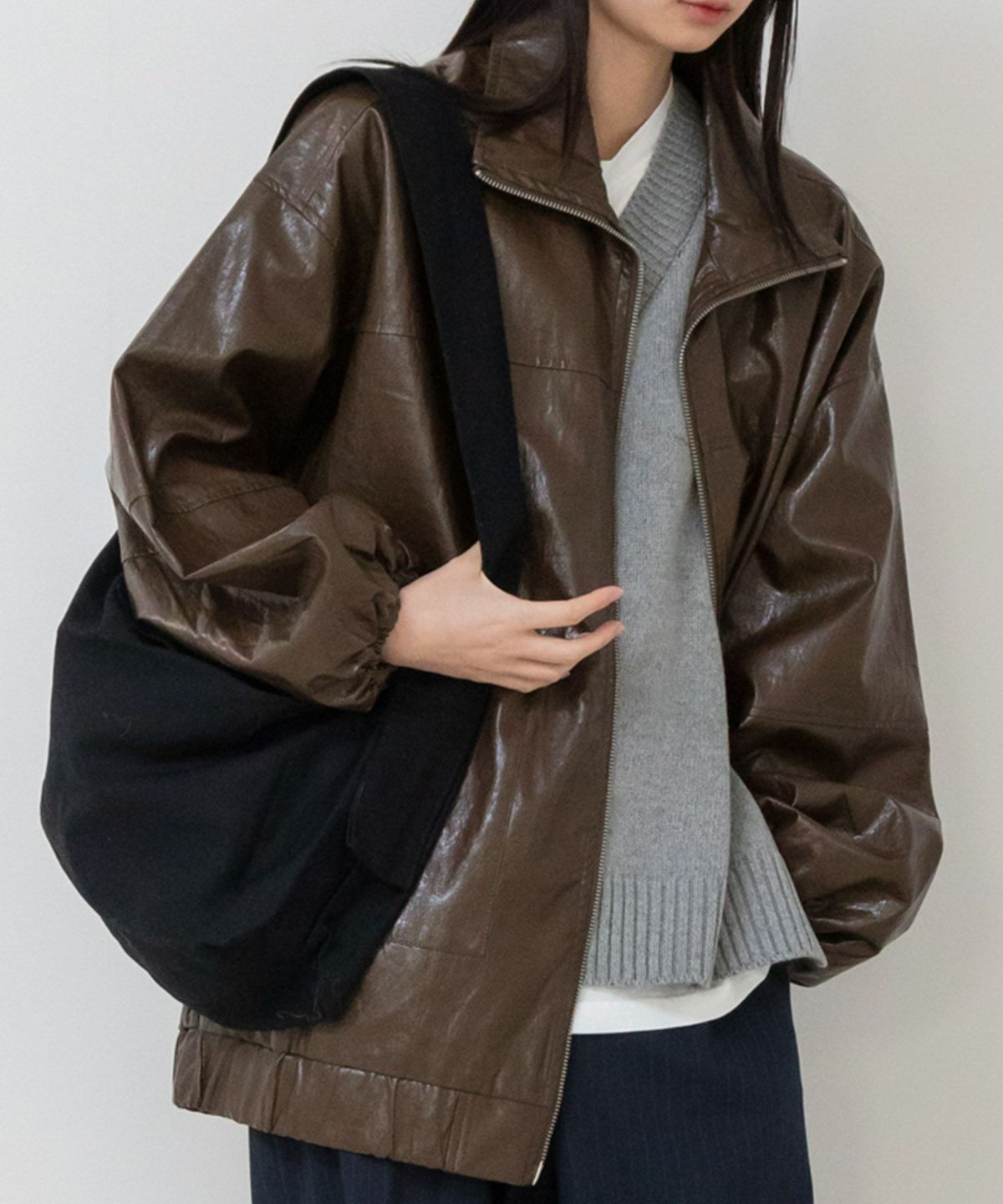 ヴィンテージ感のある雰囲気に仕上げたフェイクレザーブルゾン Vintage Like Fake Leather Stand Blouson