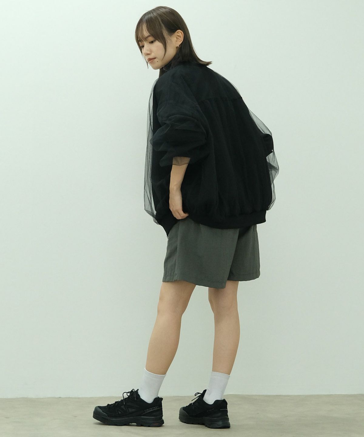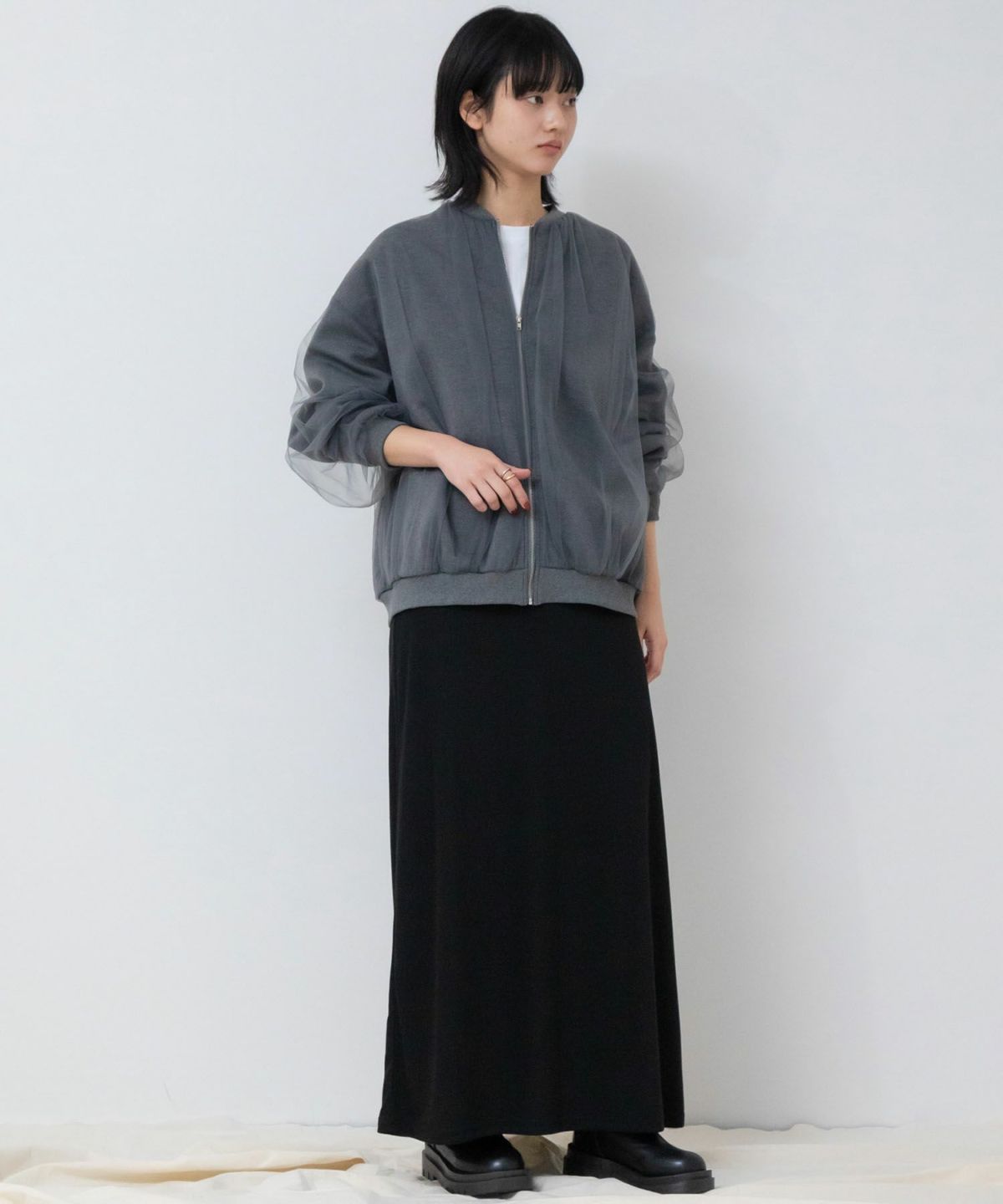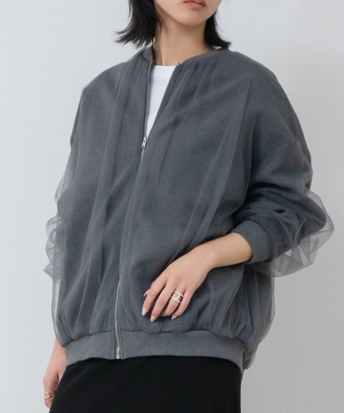ふわっとチュール生地をたっぷりと重ねたトレンドライクなレイヤードブルゾン Cardboard Zip Tulle Blouson