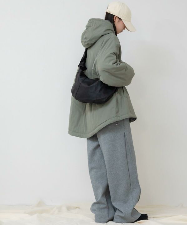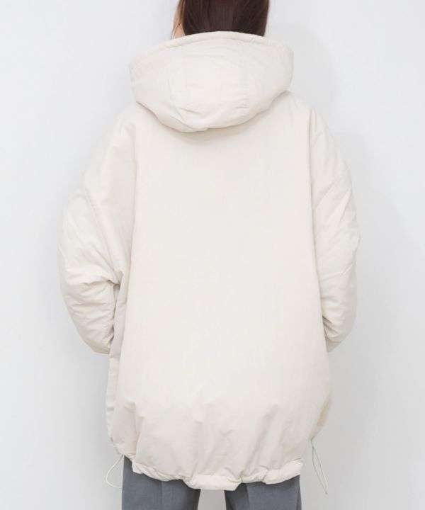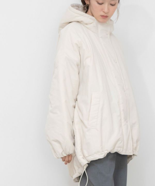 ゆるやかなAラインのフレアシルエットですが裾のドローストリングを引いて着ると、丸みのあるコクーンシルエットに。