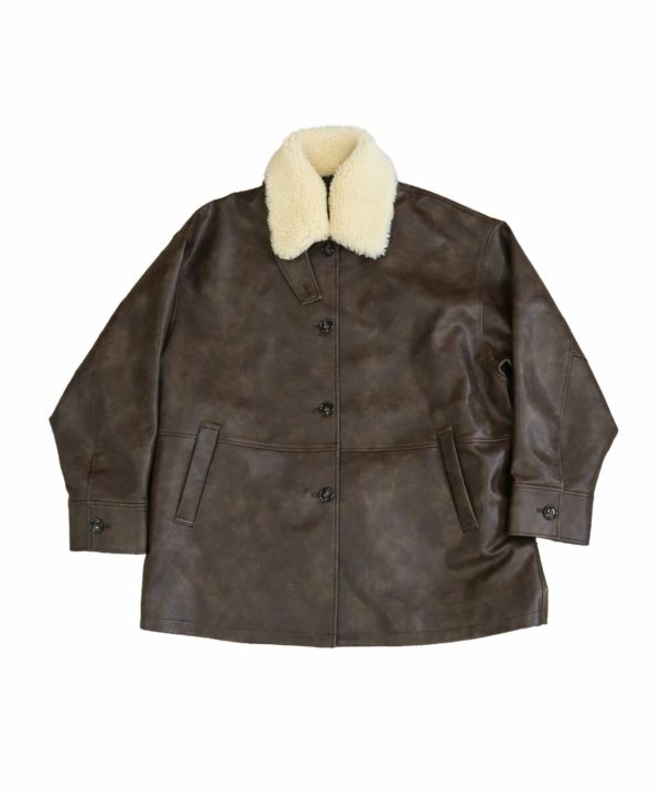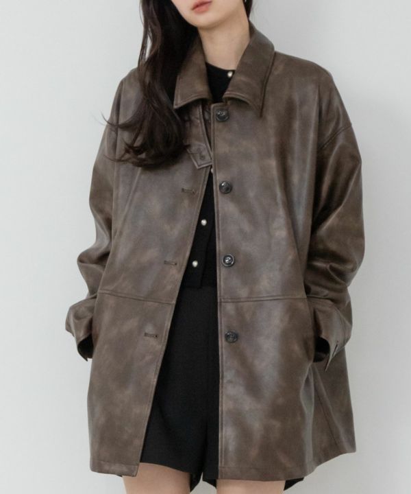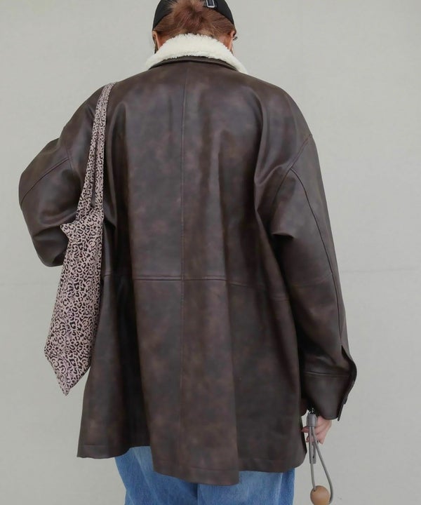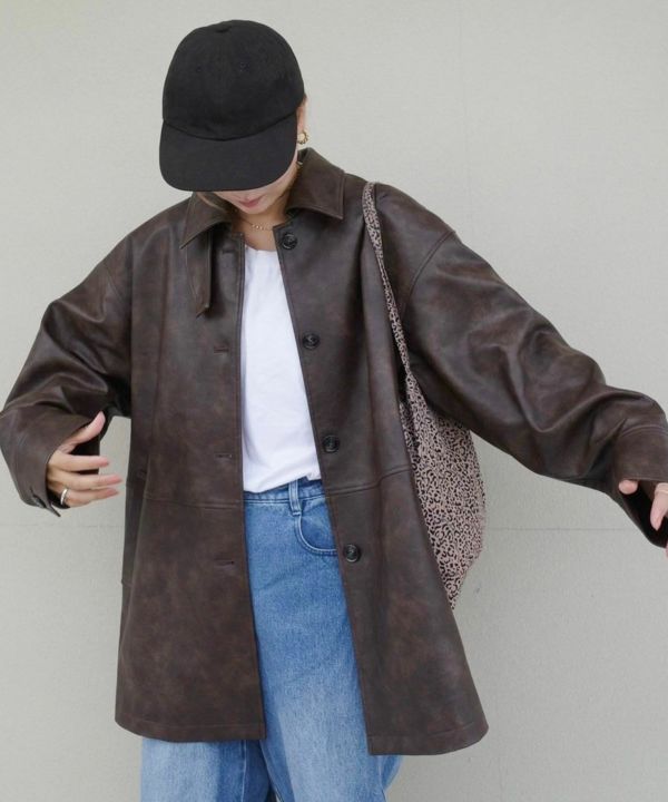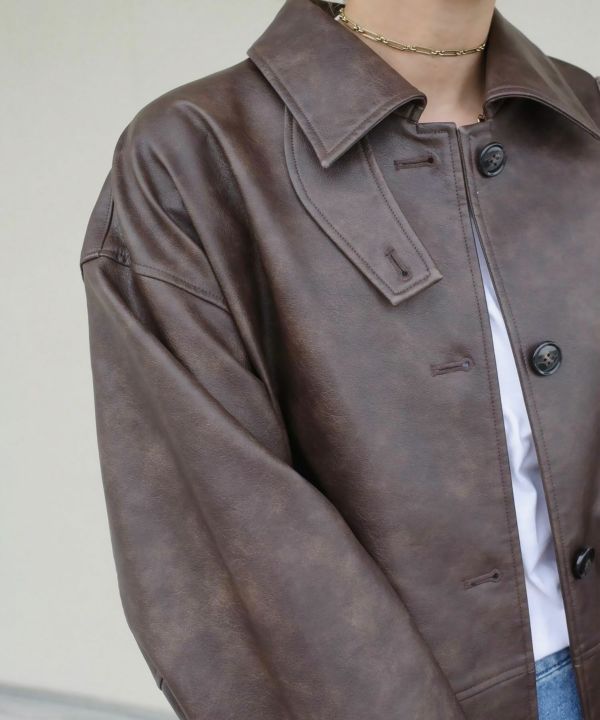 古着のようなヴィンテージライクなフェイクレザー素材で仕立てたジャケット。