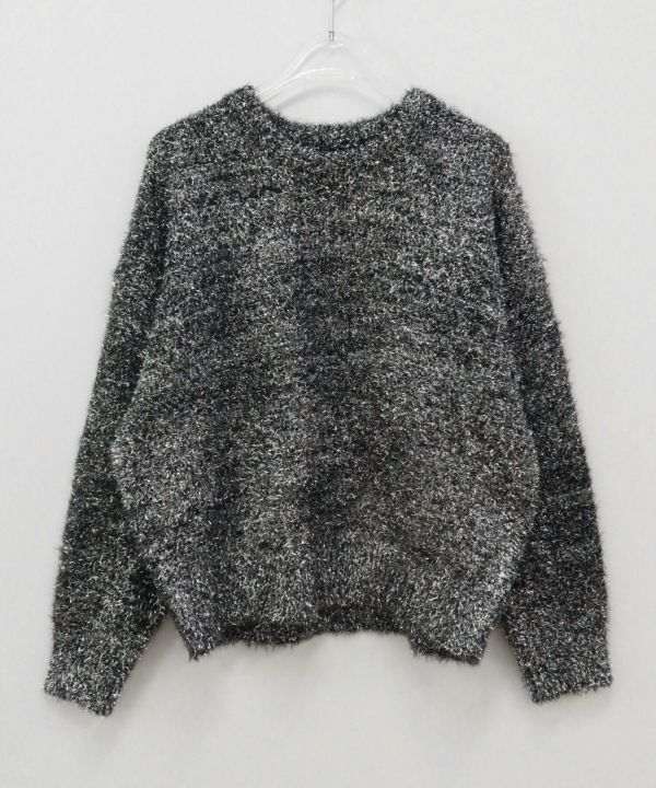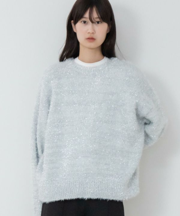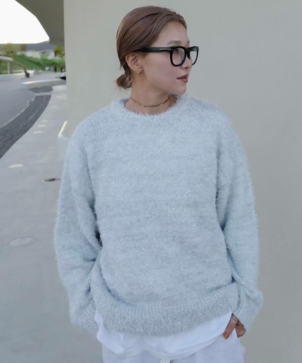 ふんわりとしたフェザーニットとラメの組み合わせが、トレンド感を後押しします。