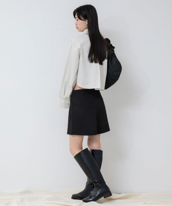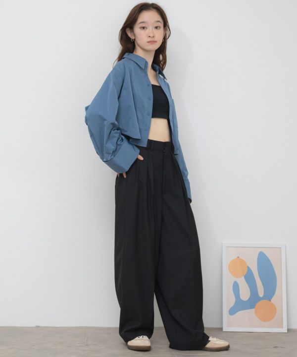 ショート丈なのでワイドパンツやボリュームスカートと合わせたスタイリングがおすすめ。