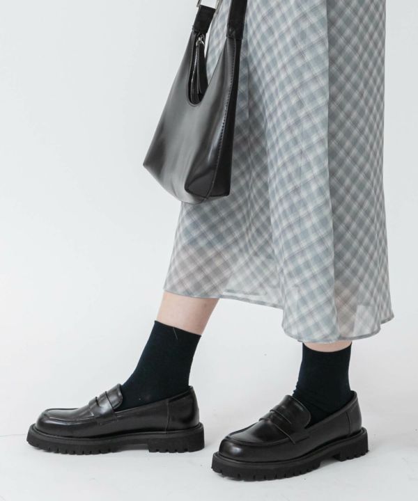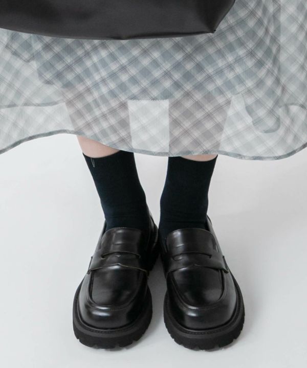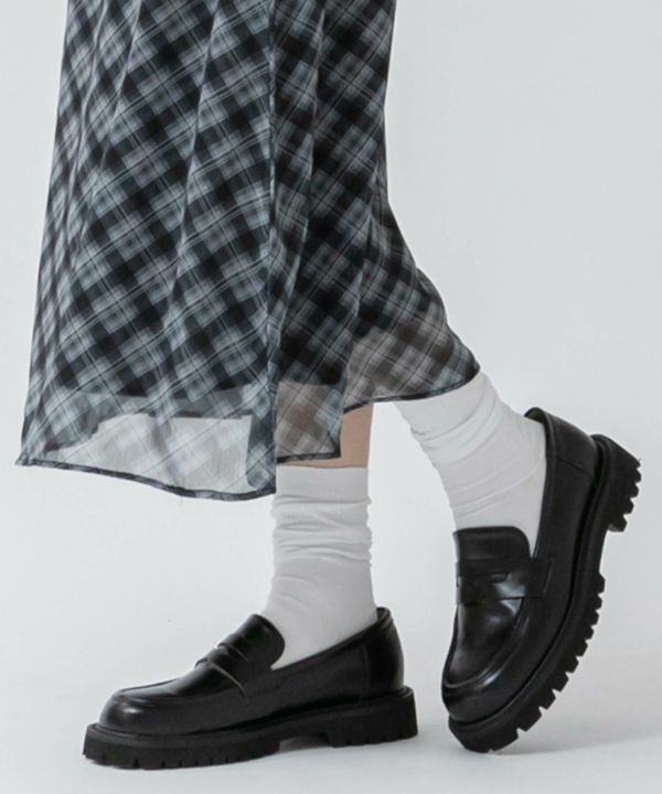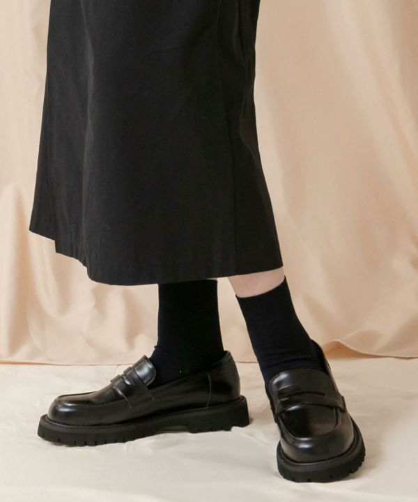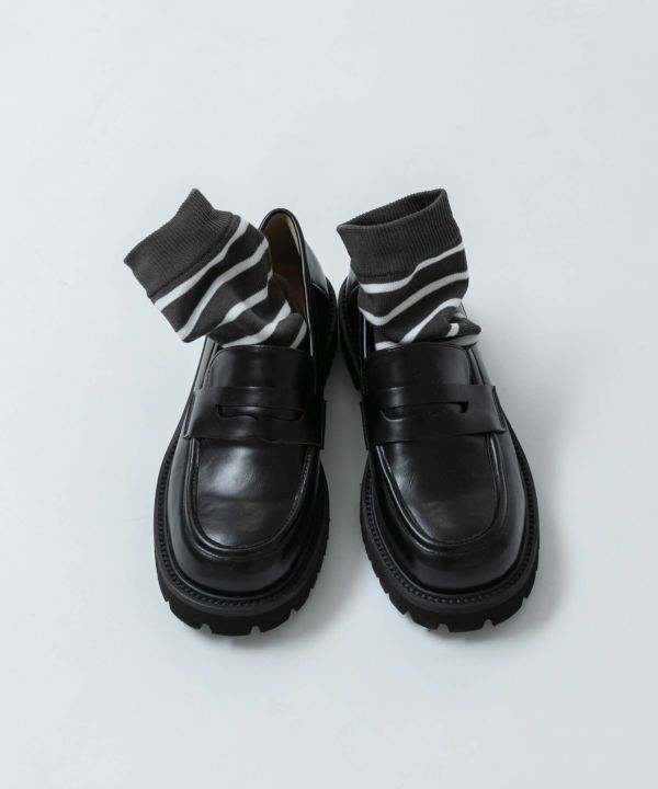 すっきりとしたフォルムに、ボリューム感のあるトラックソールを組み合わせたプレーンローファー。