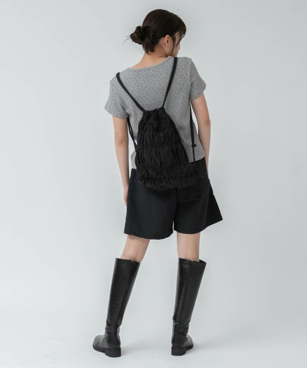 ジャージ素材のパンツにコンパクトなTシャツを合わせて、シャーリングナップサックで外すのがおすすめ。