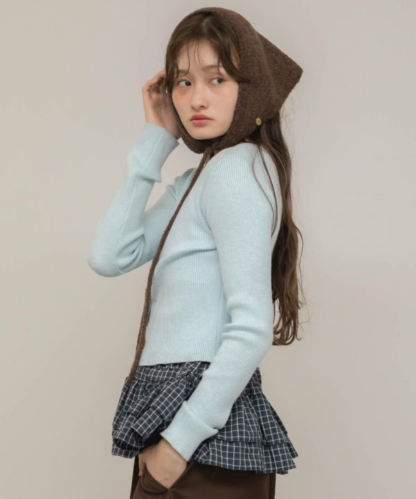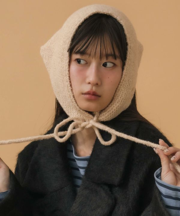 顎下で結ぶリボンタイが印象的なニット帽。