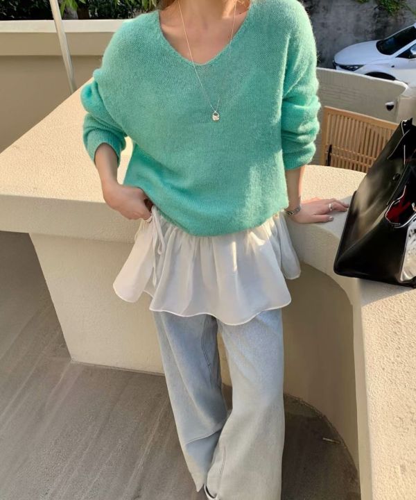 ハイウエストの切替からふわりと広がるペプラムラインが立体感のあるシルエットを生み、重ね着の奥行きと軽やかさを演出します。