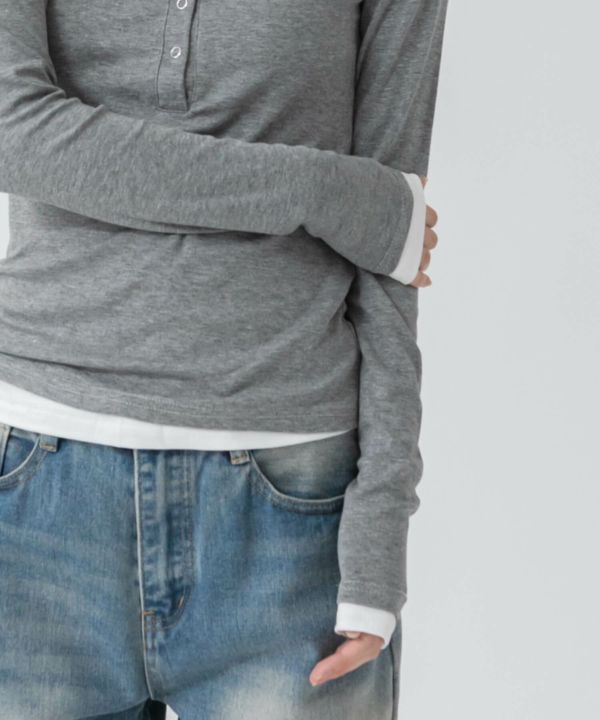 レイヤード風のデザインが特徴的なヘンリーネックカットソー。