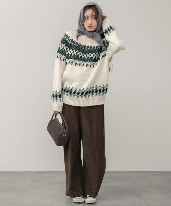 シーズンムードを高めてくれるノルディック柄を、バランスよく配置したクルーネックニットトップス。