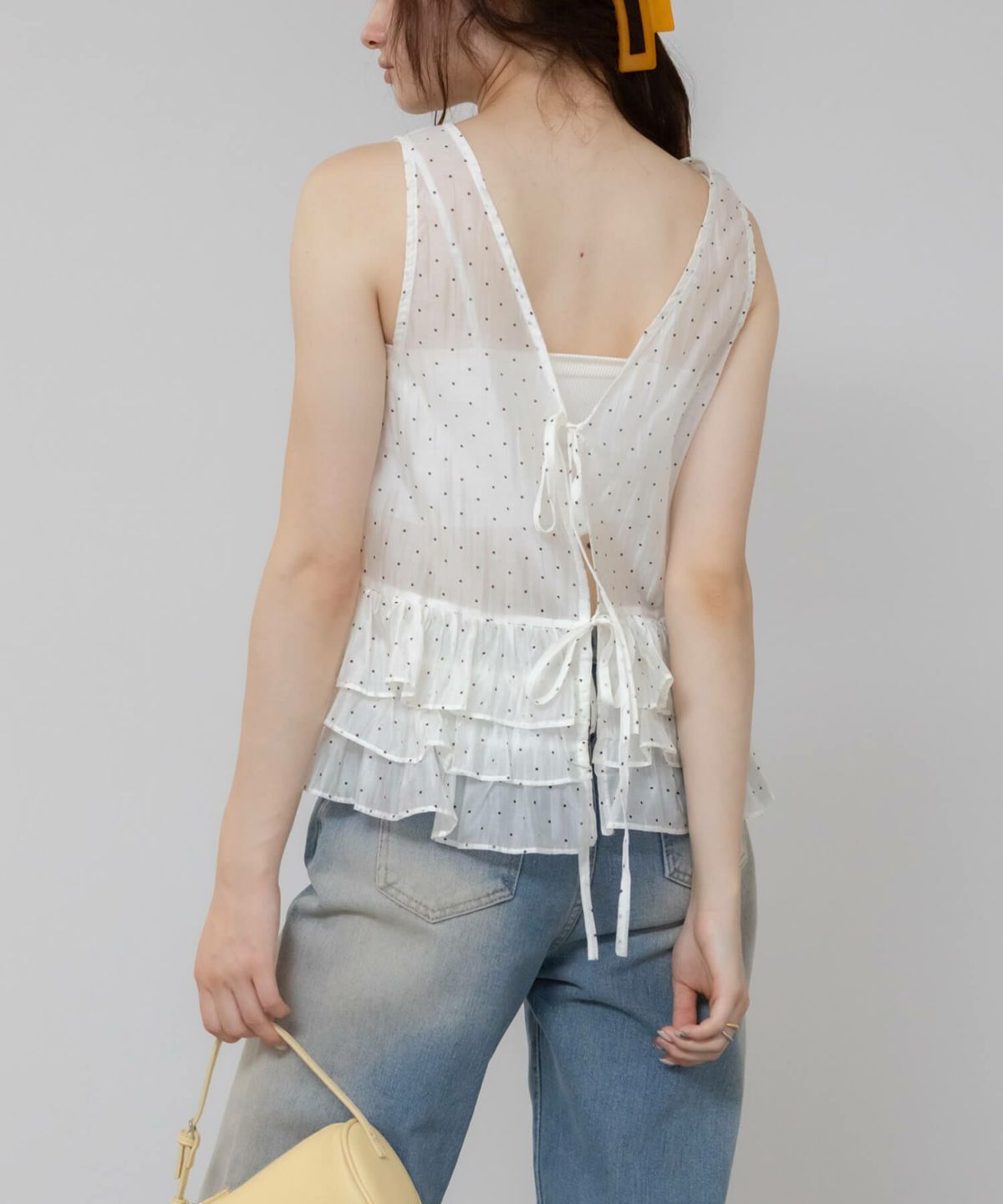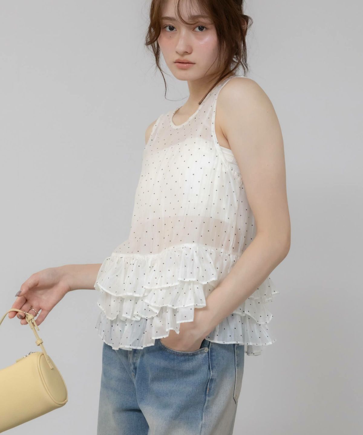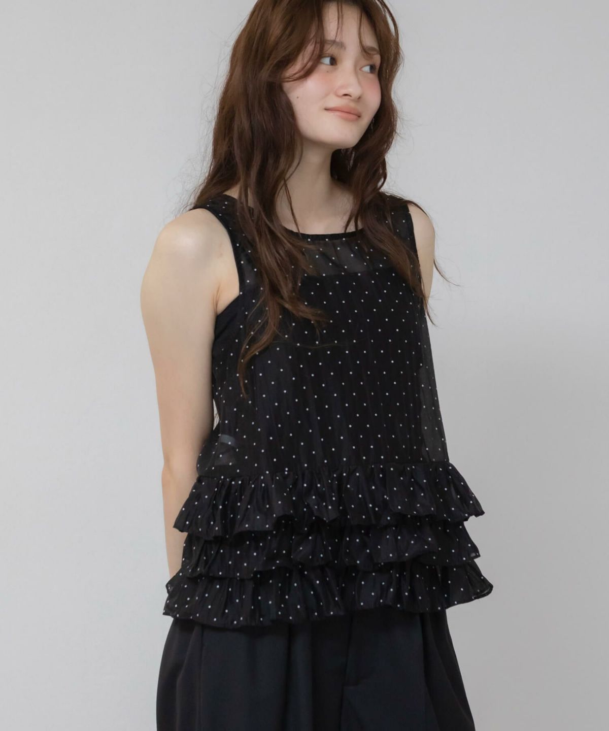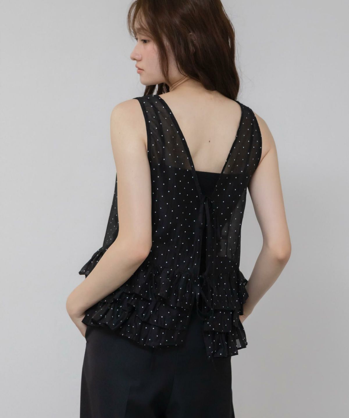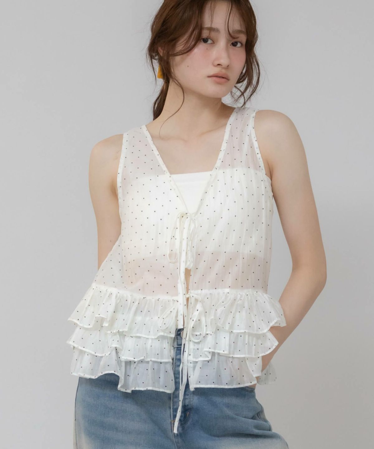 軽やかに纏う、ドットチュールの甘いアクセント。 Hooded Dot Sheer Top