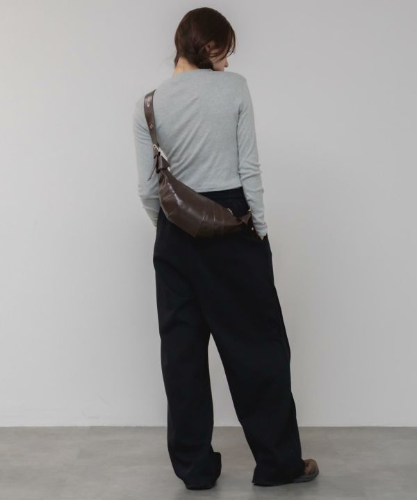 ワイドスラックスにスニーカーを合わせ、