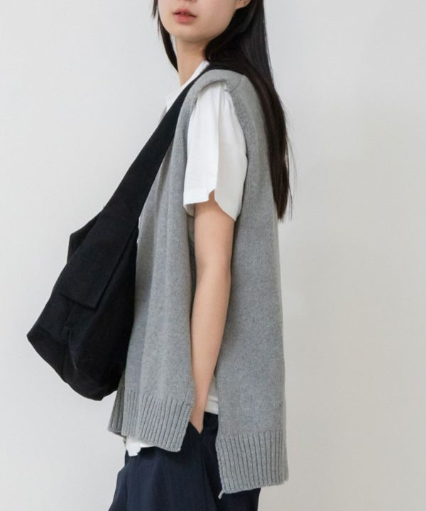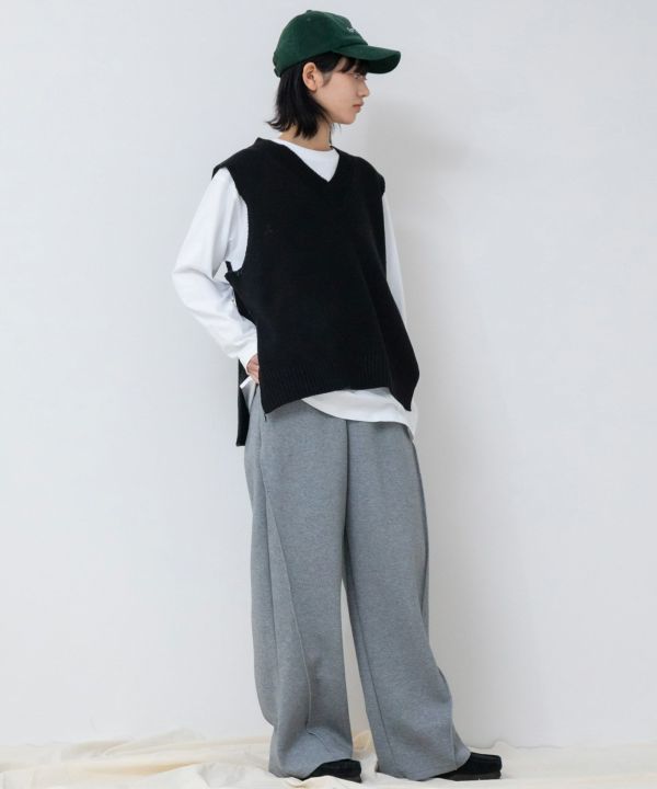 シンプルなデザインながらも深めなサイドスリットが抜け感とこなれ感を演出してくれます。前後差のある裾は前はすっきりとみせ、腰回りをしっかりカバーしてくれます。Vネック部分は太めなリブ仕様で、首元はすっきりした印象に。袖口が広く、袖幅の広いスウェットやシャツにも合わせやすいデザインです。