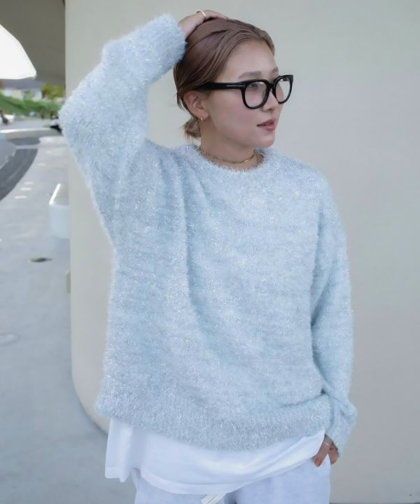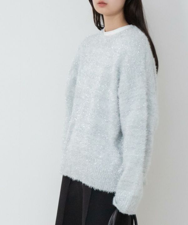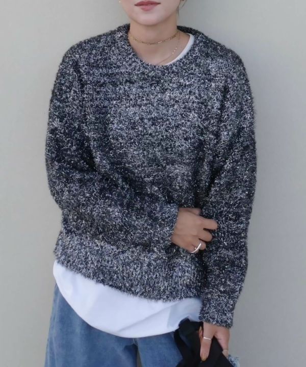 ふんわりとしたフェザーニットとラメの組み合わせが、トレンド感を後押しします。