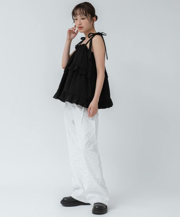 バスト・ウエストラインで切り替えたたっぷりのティアードが生み出すフレアシルエットが可愛いトレンドライクなデザインキャミソール。