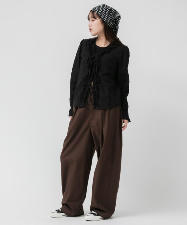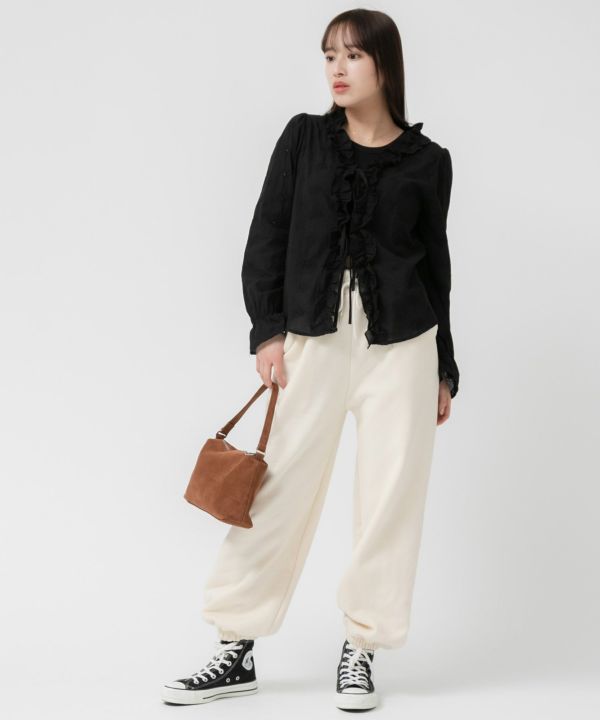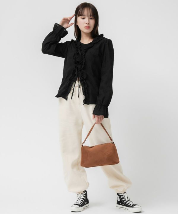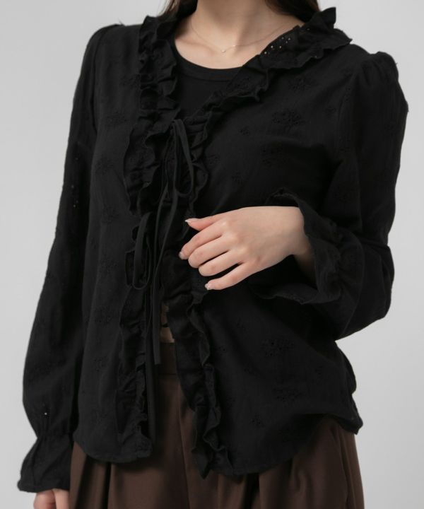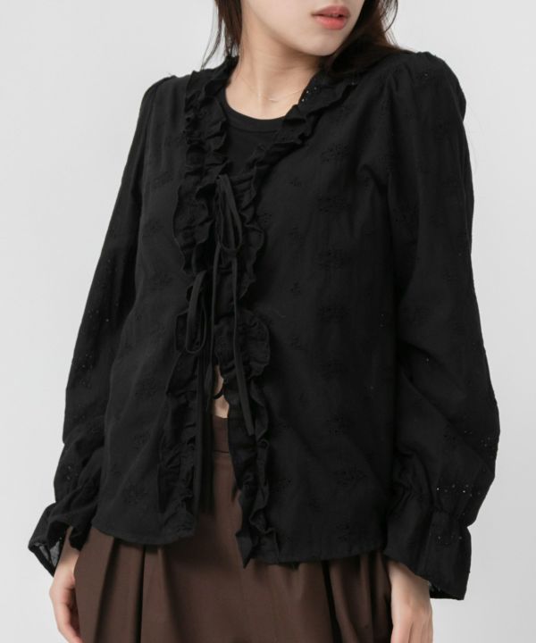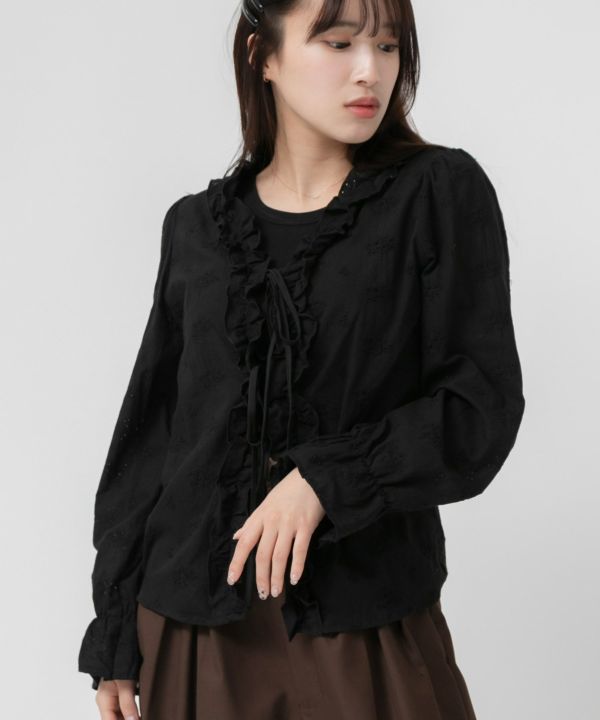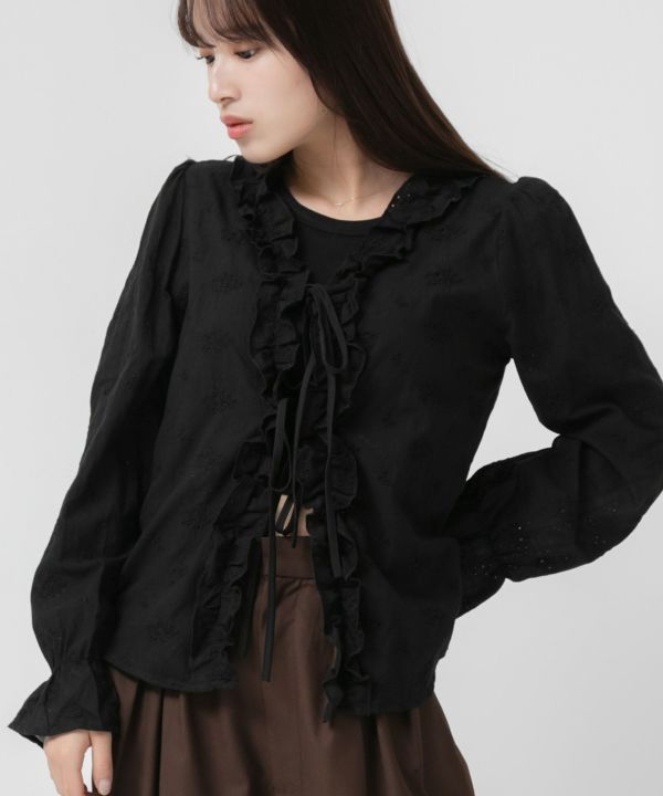 フリルをあしらったネックラインが顔周りを華やかに見せ、カジュアルからきれいめまで幅広いコーディネートに馴染みます。