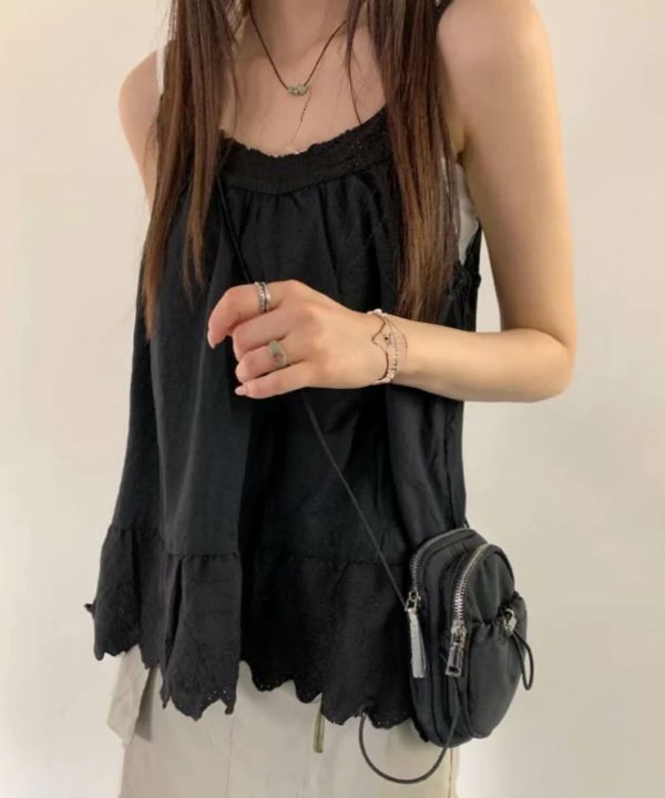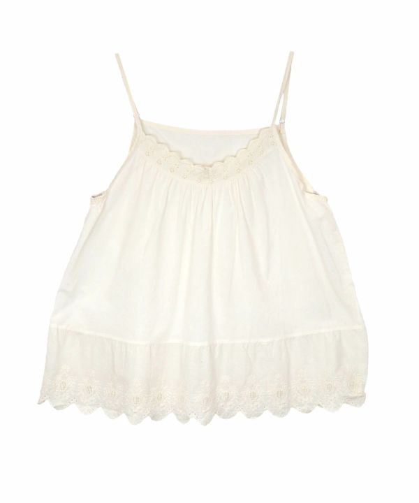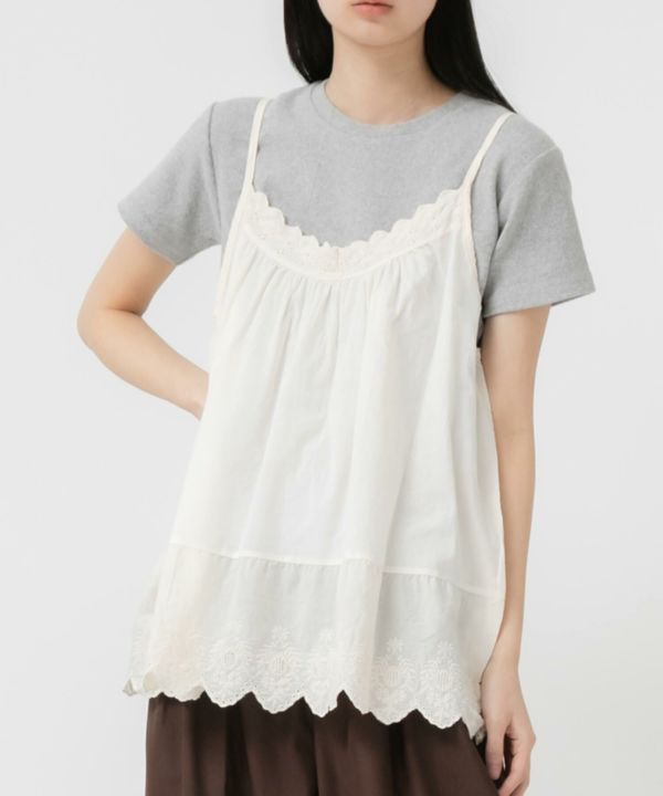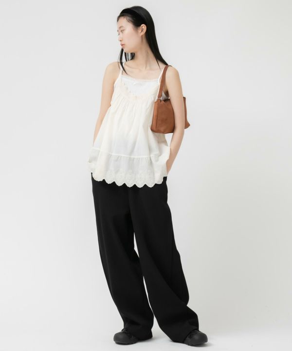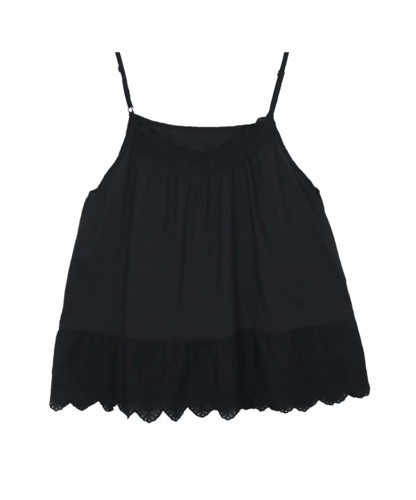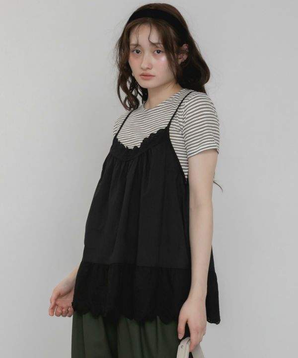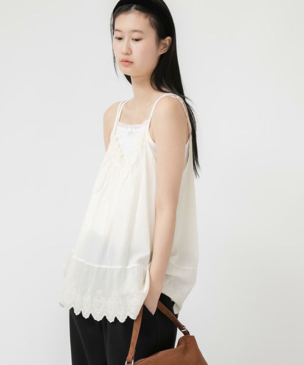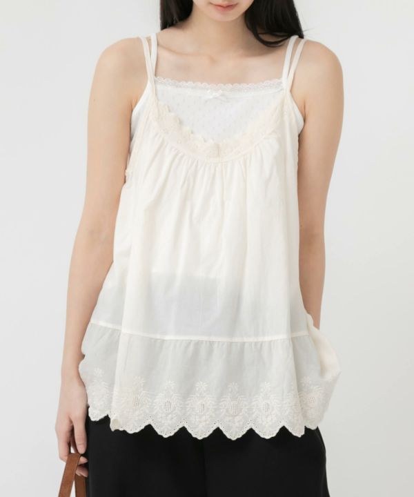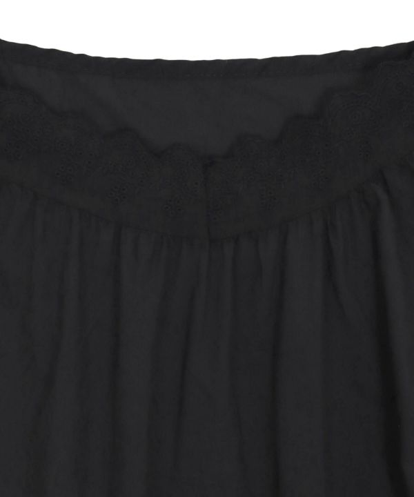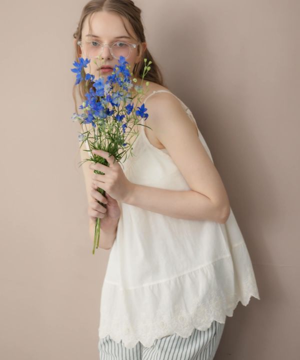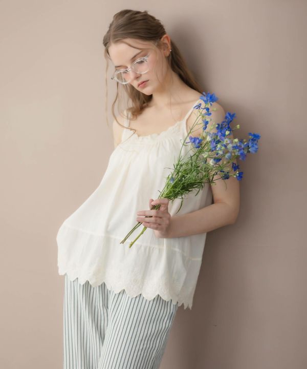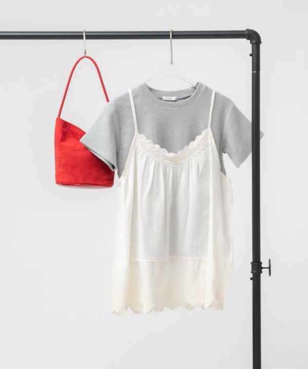 胸元と裾部分にスカラップデザインを施し、フェミニンな雰囲気を演出します。