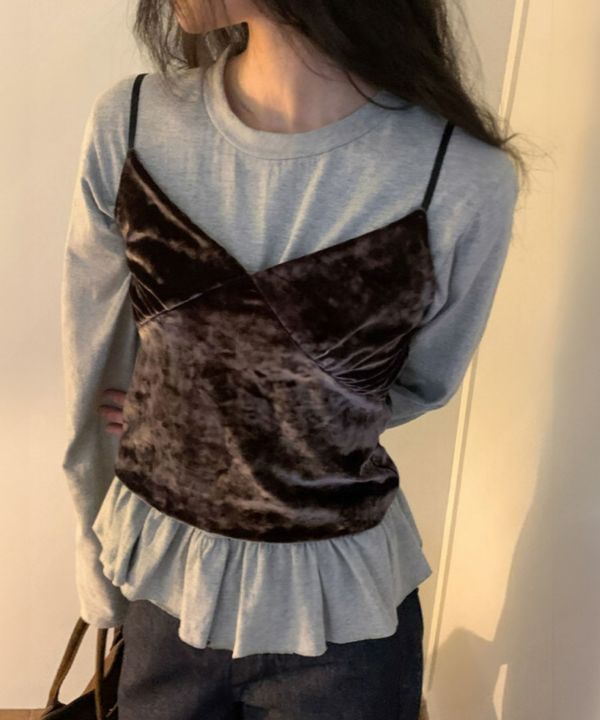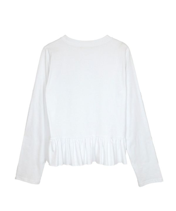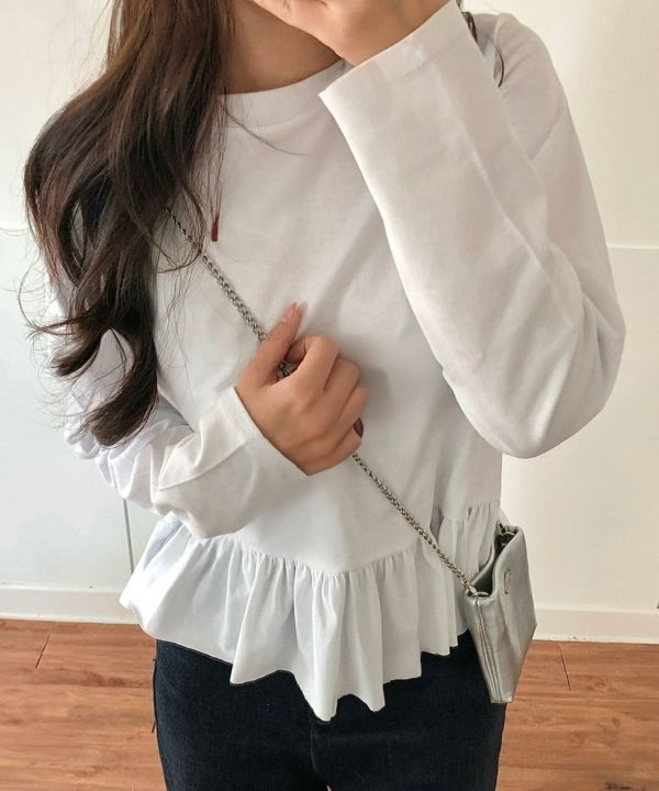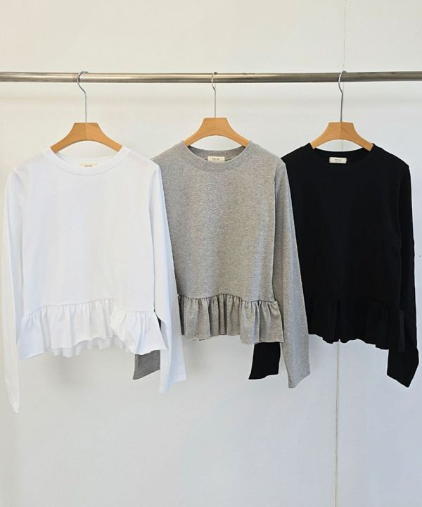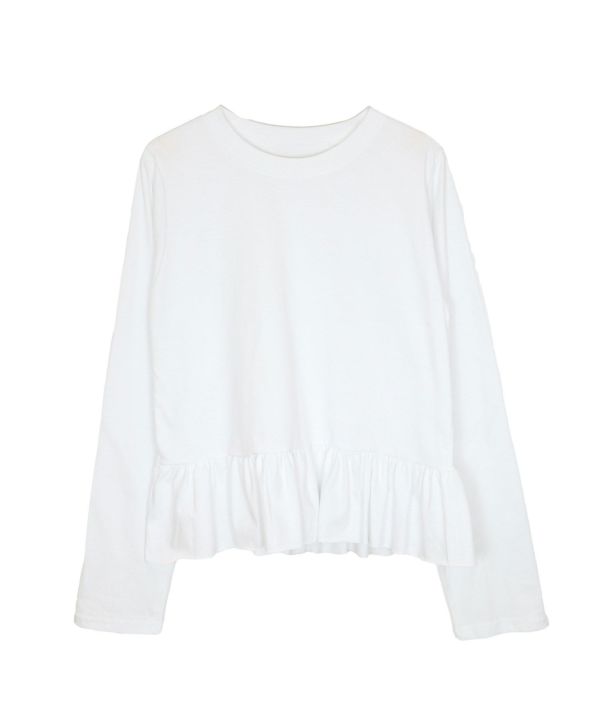立体的なAラインシルエットに裾の切り替えからフワッと広がるフリルがポイント。1枚でもインナーとしても楽しめる、シンプルながらも華やかな1枚。程よくフィットしながら大人の可愛さを演出する裾フリルTシャツです。