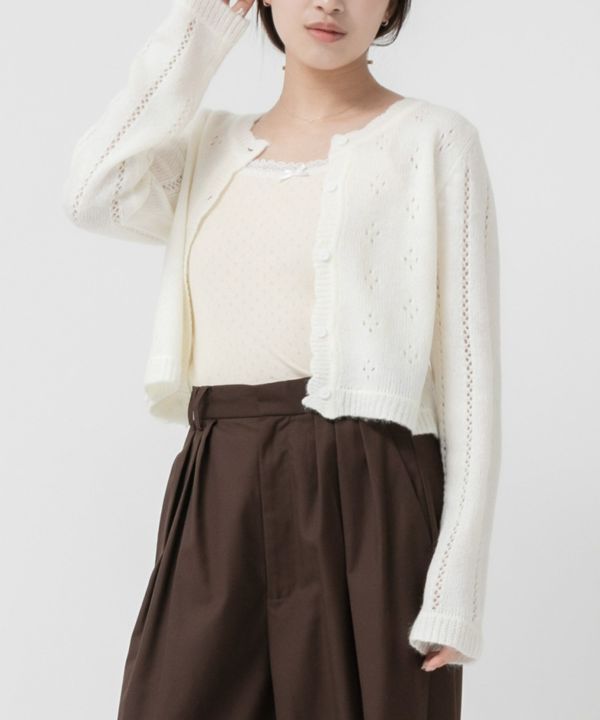前立てのスカラップや透かし柄がヴィンテージライクなムードの柄ニット。