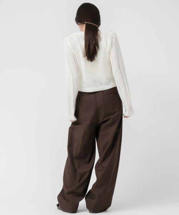 コンパクトなシルエットなのでボトムスはボリュームのあるタックパンツやワイドパンツとの相性が抜群◎