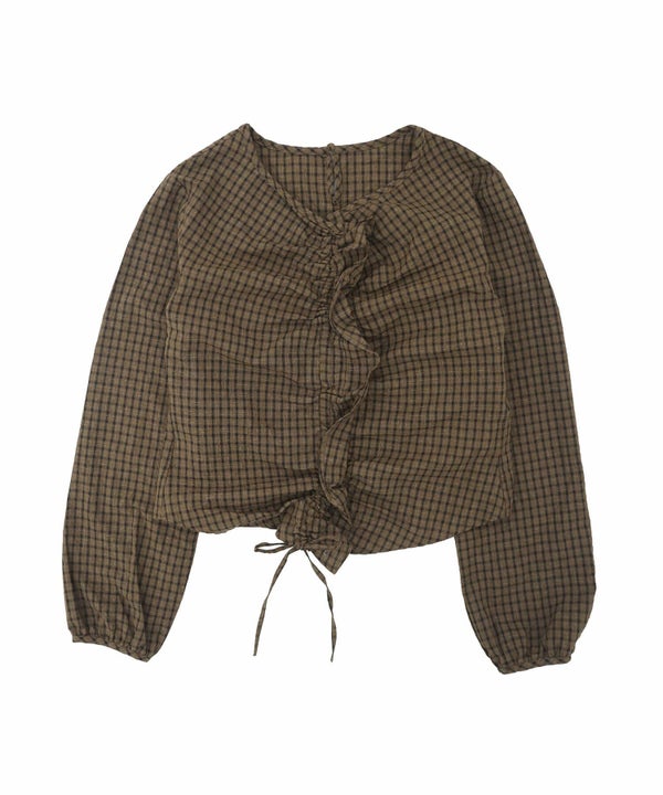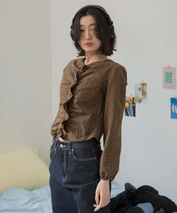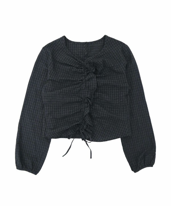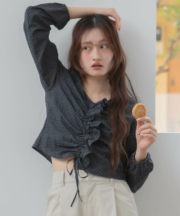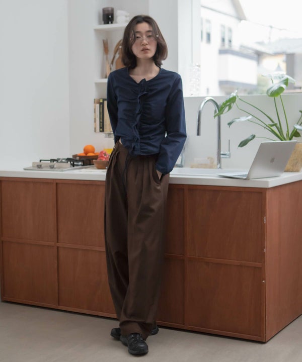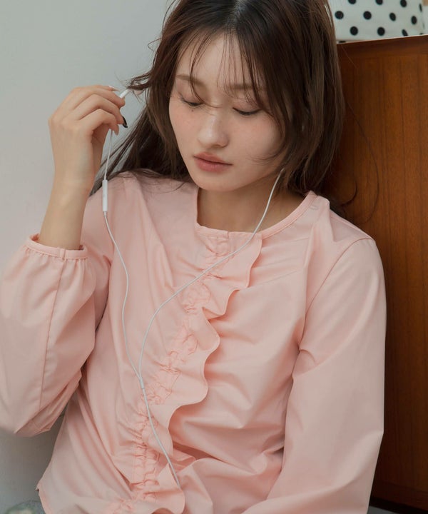 フロントにあしらった立体的なフリルとシャーリングが目を惹く主役ブラウス。