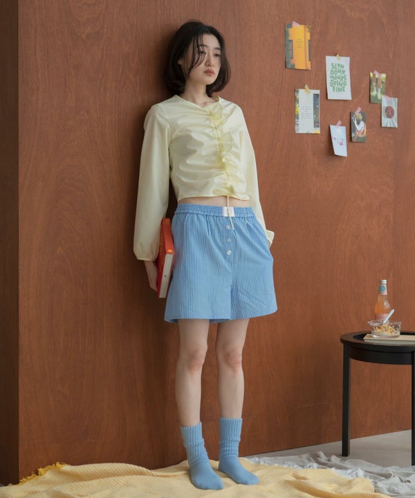コンパクトな丈感で、ハイウエストボトムやワイドパンツとも好相性。