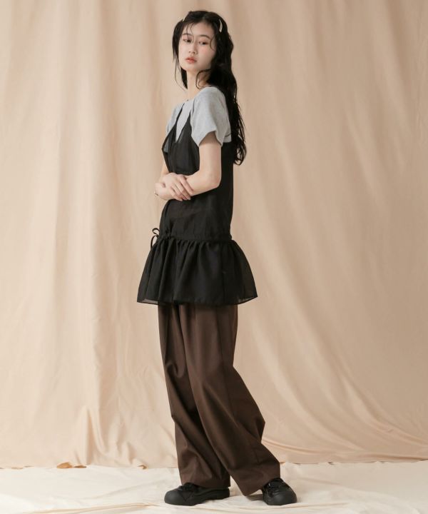 ハイウエストの切替からふわりと広がるペプラムラインが立体感のあるシルエットを生み、重ね着の奥行きと軽やかさを演出します。