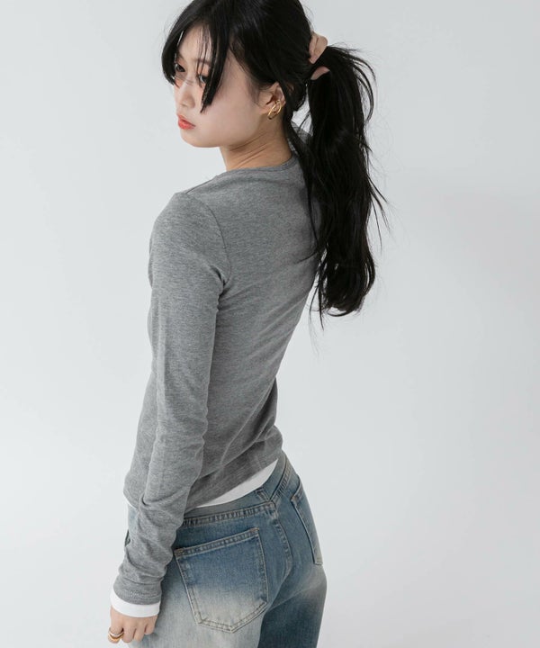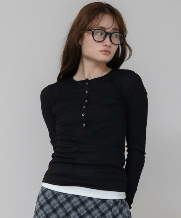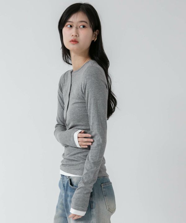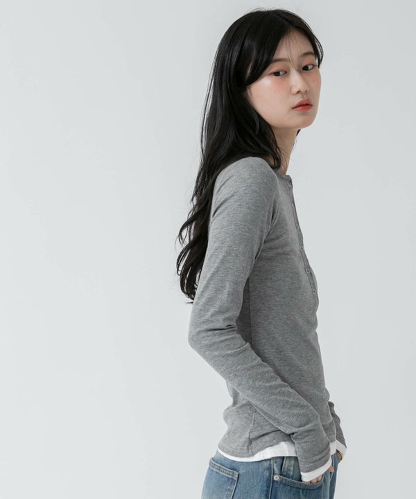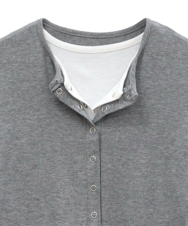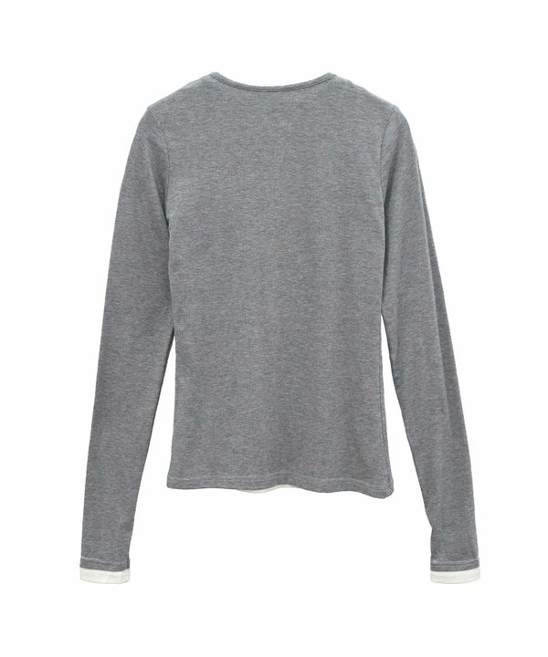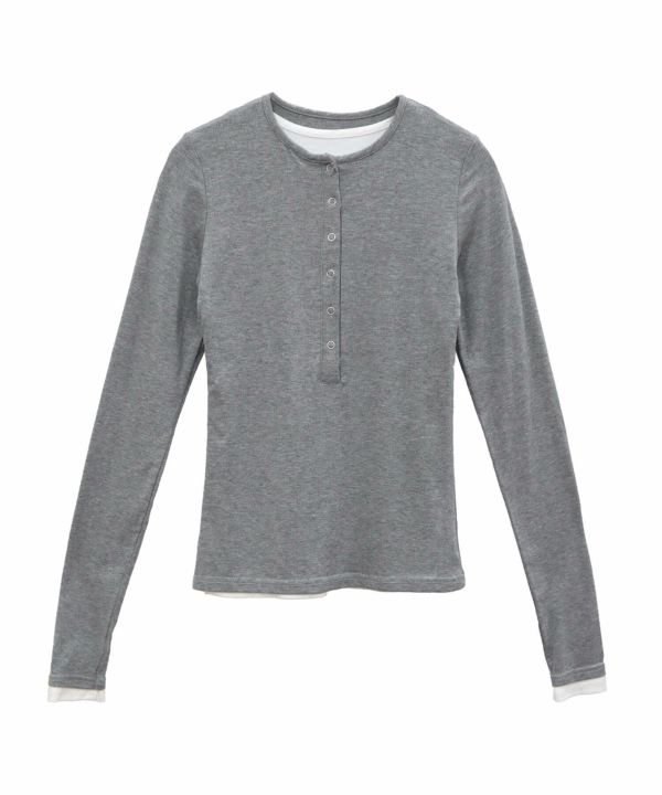 レイヤード風のデザインが特徴的なヘンリーネックカットソー。