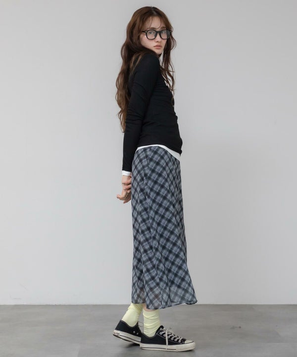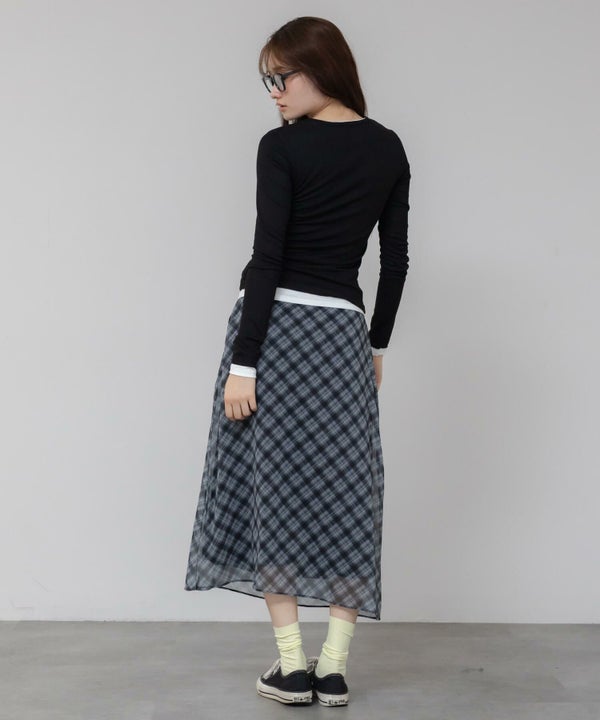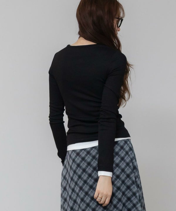 シンプルながらもレイヤード風デザインがアクセントになり、1枚で決まるアイテム。